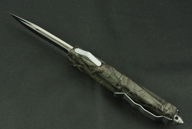 全 长: 23cm 刃 长: 9cm 刃 厚: 2.8mm 刃 材: 440 硬 度: 57HRC 刀 重: 220g 毛 重: 340g 表 面: 氧化白 柄 材: 锌铝合金 刀 鞘: 尼龙 锁 闭: 直出弹簧刀