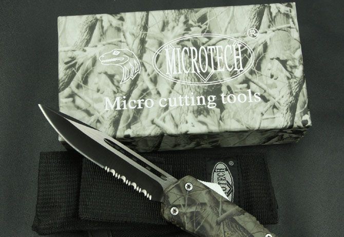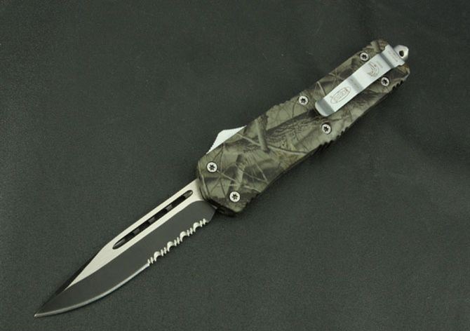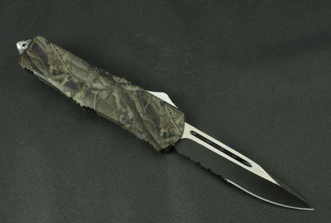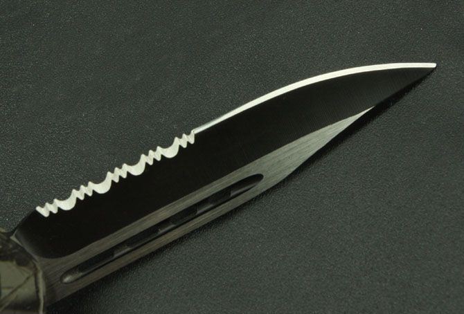 新版伤齿龙单锋半齿(披履) 全 长: 23cm 刃 长: 9cm 刃 厚: 2.8mm 刃 材: 440 硬 度: 57HRC 刀 重: 220g 毛 重: 340g 表 面: 氧化白 柄 材: 锌铝合金(被履) 刀 鞘: 尼龙 锁 闭: 直出弹簧刀