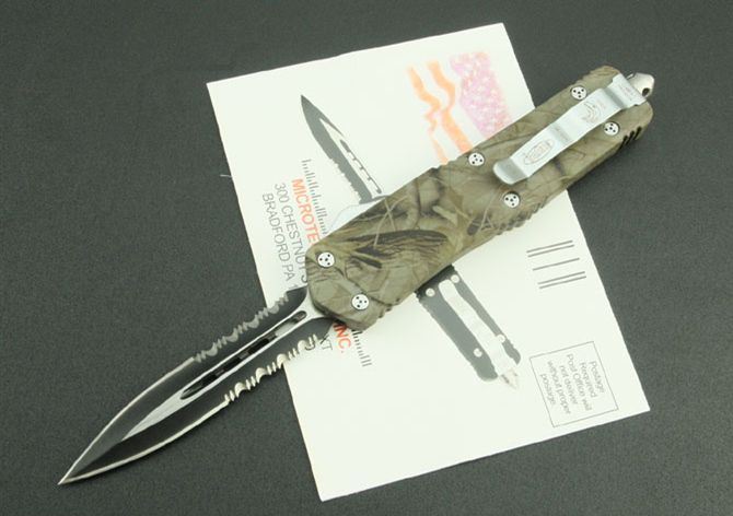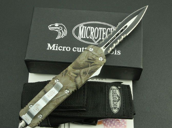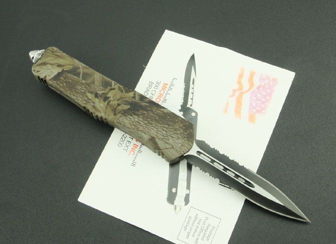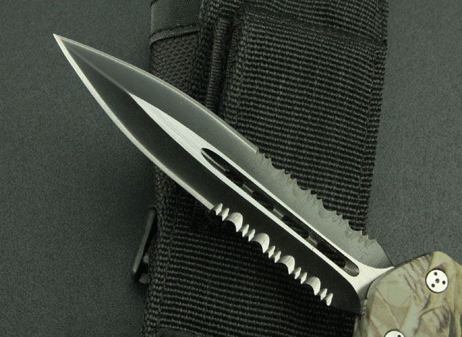 新版伤齿龙双锋半齿(披履) 全 长: 23cm 刃 长: 9cm 刃 厚: 2.8mm 刃 材: 440 硬 度: 57HRC 刀 重: 220g 毛 重: 340g 表 面: 氧化白 柄 材: 锌铝合金(披履) 刀 鞘: 尼龙 锁 闭: 直出弹簧刀