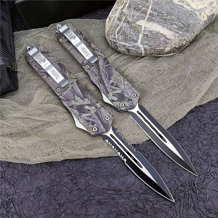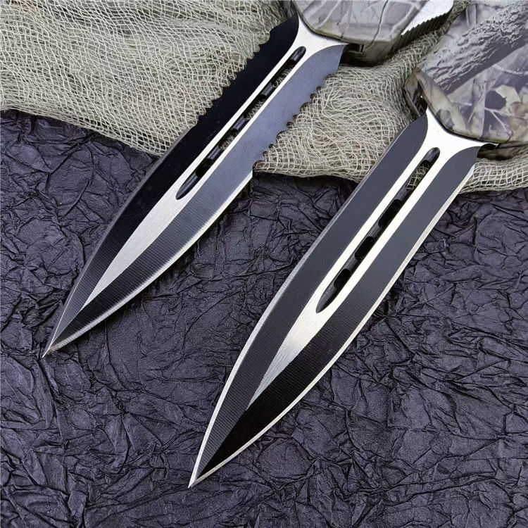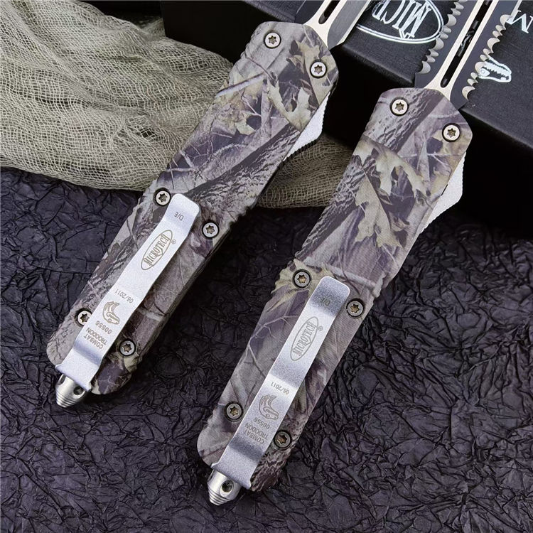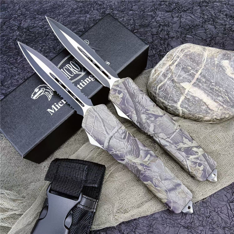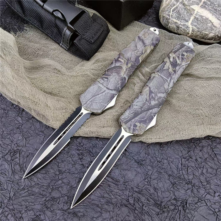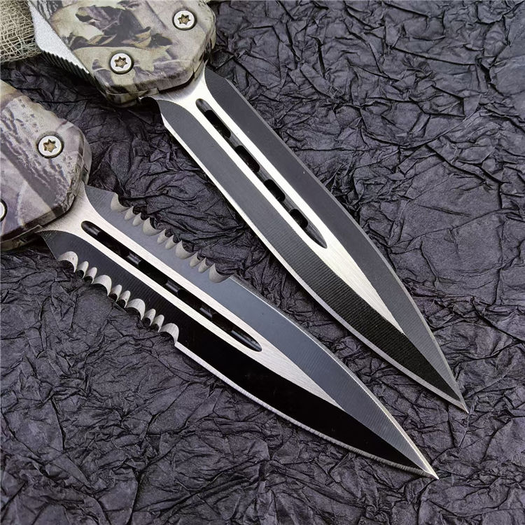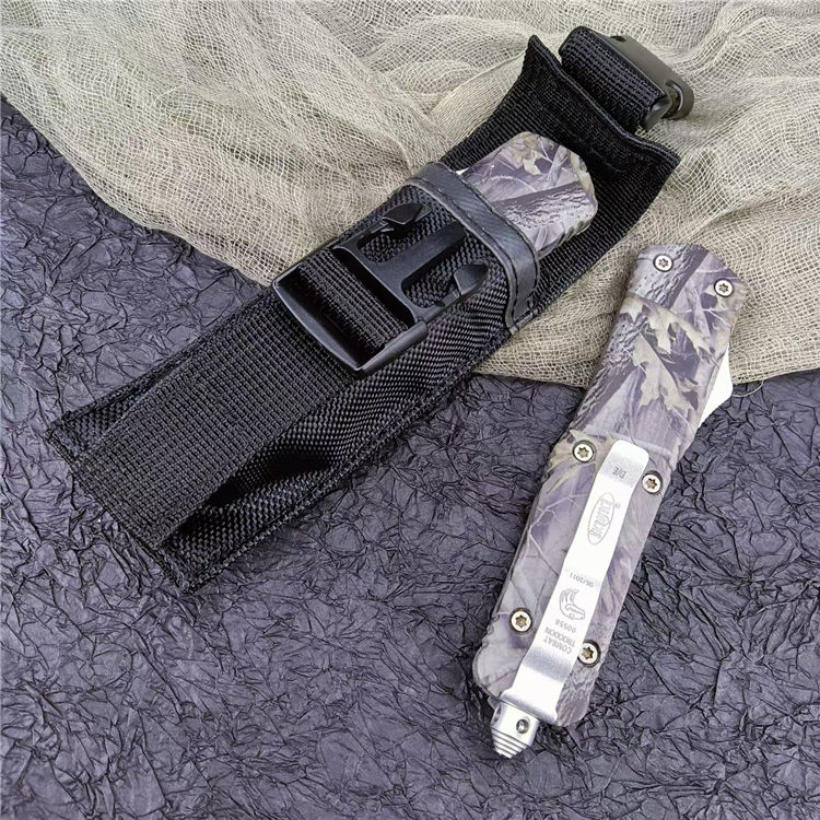 新版伤齿龙双锋全刃(披履) 全 长: 23cm 刃 长: 9cm 刃 厚: 2.8mm 刃 材: 440 硬 度: 57HRC 刀 重: 220g 毛 重: 340g 表 面: 氧化白 柄 材: 锌铝合金(被履) 刀 鞘: 尼龙 锁 闭: 直出弹簧刀