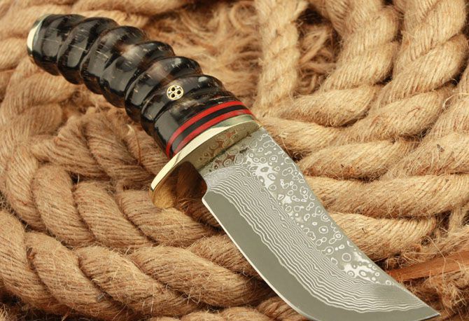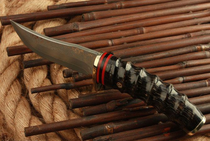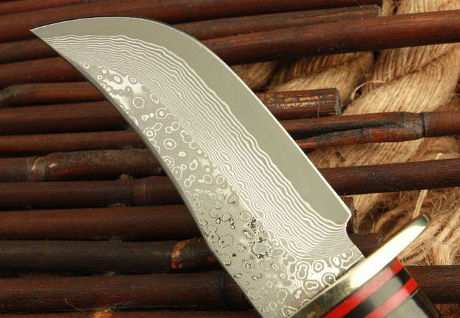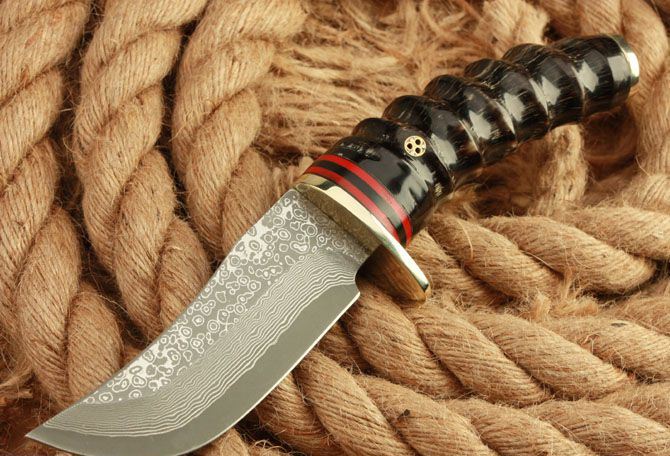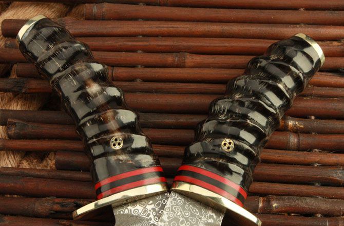 全 长: 22cm 刃 长: 10cm 柄 长: 11.5cm 刃 宽: 3.5cm(最宽处) 硬 度: 58HRC 刃 厚: 0.45cm 柄 材: 野生黄羊角 重 量: 540克(含包装) 刃 材: 大马士革钢 表 面: 大马士革钢特有的花纹原色 其 他: 配高档礼品盒.护刀油.擦刀布,真皮套 大马士 革钢花纹和把手木纹及颜色各异,以实物为准!