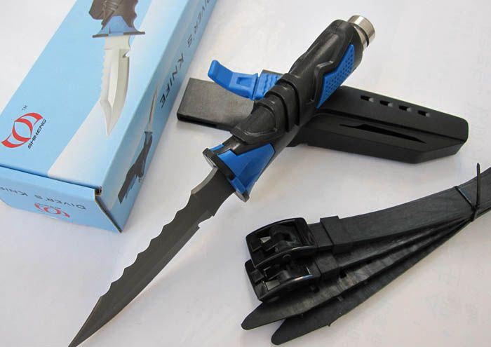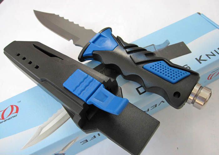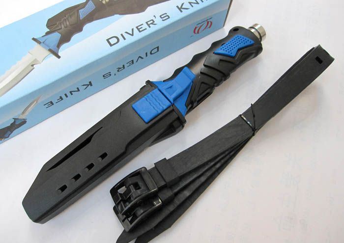 钛合金军用潜水刀(尖头蓝色) 全 长: 25.5cm 刃 长: 12.5cm 刃 厚: 3.3mm 刃 材: 钛合金 硬 度: 58HRC 刀 重: 180g(超轻) 总 重: 380g 表 面: 喷砂 柄 材: 橡塑 刀 鞘: ABS