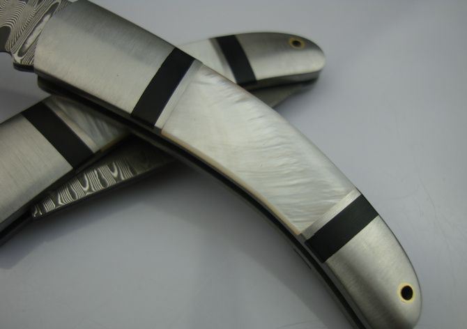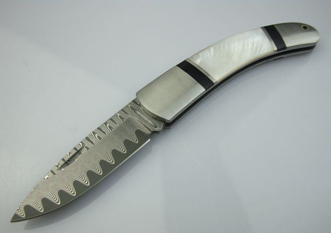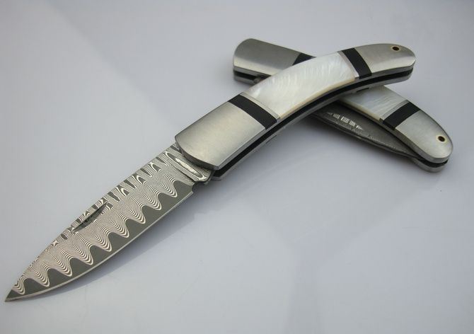 经典QQ鲍贝大马士口袋刀 全 长:12.5cm 刃 长:5cm 柄 长:7.3cm 刃 厚:2.1mm 刃 材:大马士革钢 硬 度:57HRC 刀 柄:钢头+鲍贝 表 面:大马士革花纹 锁定方式:传统锁 重 量:50.0克(包括毛绒袋) 备 注:带毛绒袋