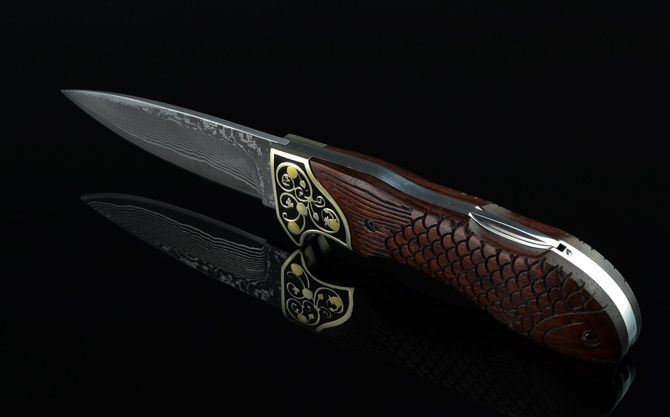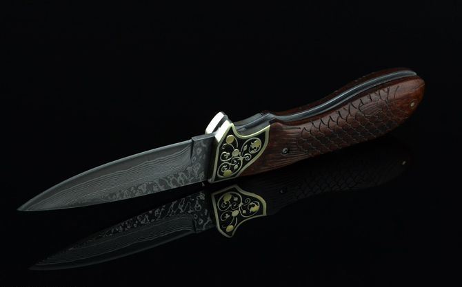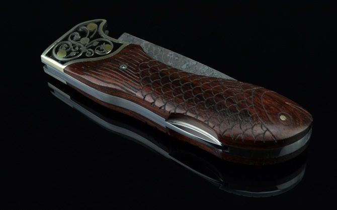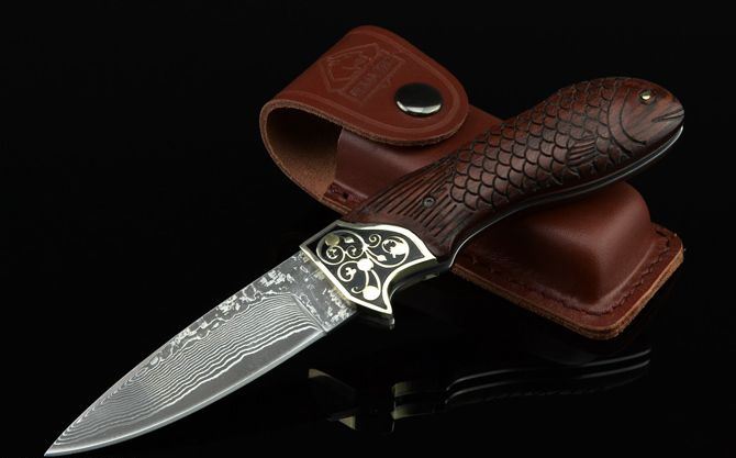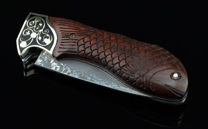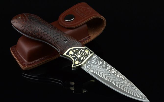 小鱼儿大马士革折刀 全 长: 21cm 刃 材: 大马士革钢 刃 长: 9cm 刃 宽: 2.6cm(最宽处) 刃 厚: 0.27m 硬 度: 58HRC 柄 材: 黑檀木+雕花纯铜铜头 柄 长: 10.8cm 表 面: 大马士革钢特有的花纹原色 重 量:220克(含皮套) 锁 闭: 背锁 其 他: 刃口锋利,真皮套。