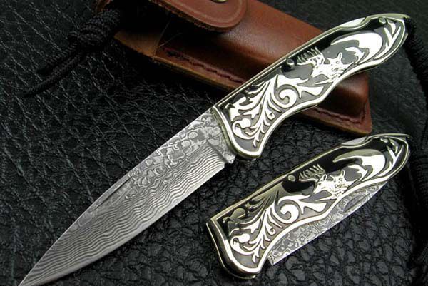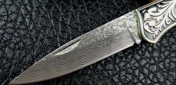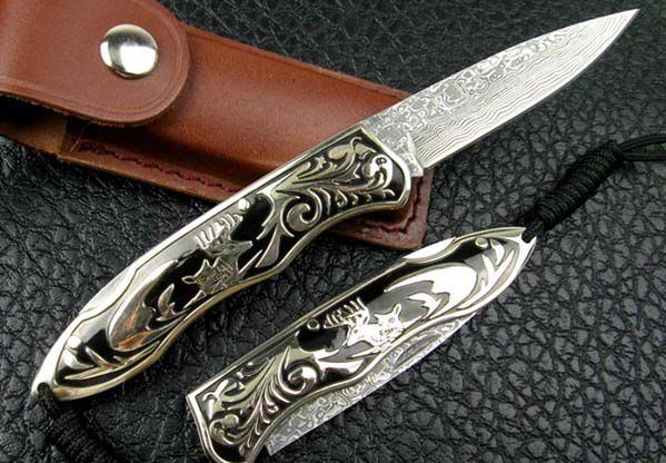 全 长: 19.7cm 刃 长: 8.5cm 刃 宽: 2.cm(最宽处) 闭 合: 11cm 刃 材: 进口大马士革钢 硬 度: 59 表 面: 大马士革钢特有的花纹原色 刃 厚: 0.29cm 柄 材: 白铜 重 量: 125克 锁 闭: 传统式制尾锁 其 他: 刃口锋利,配皮套 大马士革钢花纹和把手木纹及颜色各异,以实物为准!