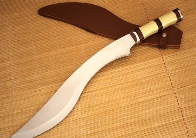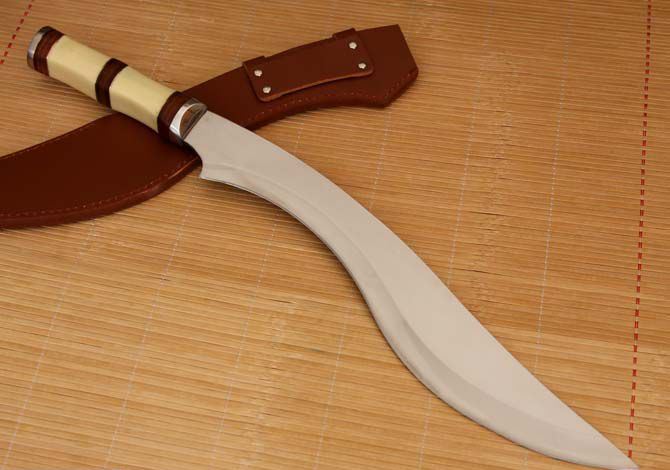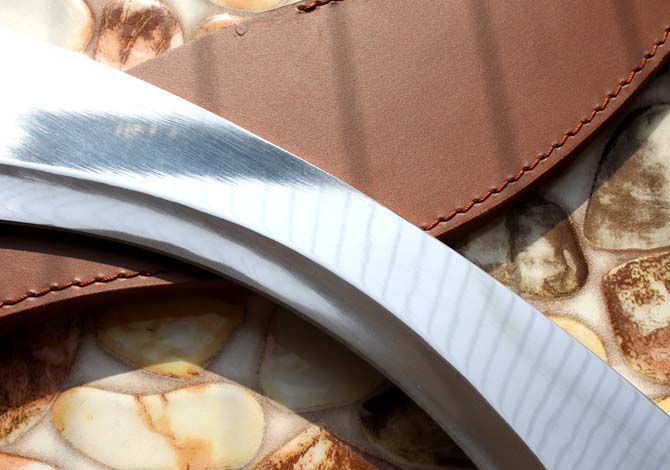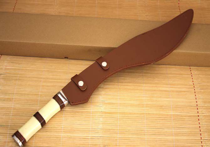 新版大号超镜光月牙弯刀 全 长: 60.8cm 刃 长: 40.3cm 刃 厚: 4.7mm 刃 宽: 6.6cm(最宽处) 刃 材: 420 硬 度: 57HRC 刀 重: 1500克(含包装) 表 面: 镜光 柄 材: 铜+钢+皮+野骨 结 构: 一体龙骨 刀 鞘: 牛皮