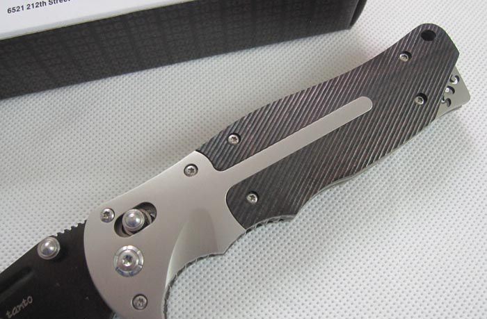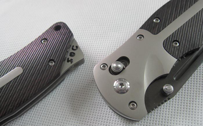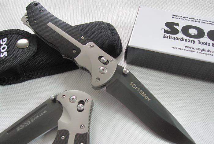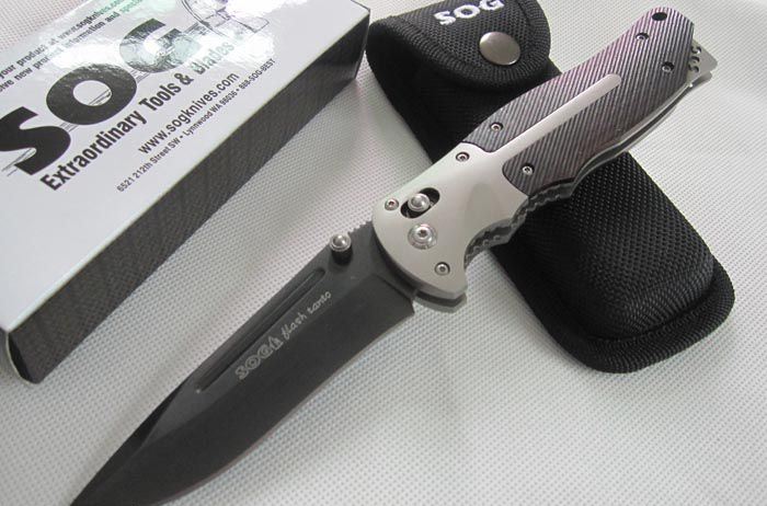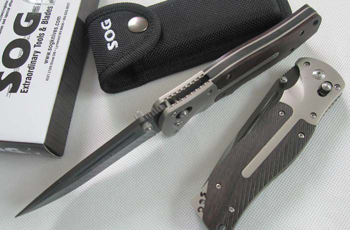 SOG312轴锁大折刀 全 长:23.5cm 刃 长:9.8cm 柄 长:13.0cm 刃 宽:3.0cm(最宽处) 刃 厚:3.8mm 刃 材:5cr13mov高级不锈钢 硬 度:58HRC 刀 柄:不锈钢内衬镶嵌斜纹黑檀木柄片 表 面:镀钛 锁 定:轴锁 重 量:300.0克 备 注:带耐磨尼龙套