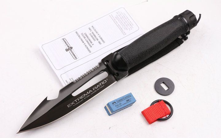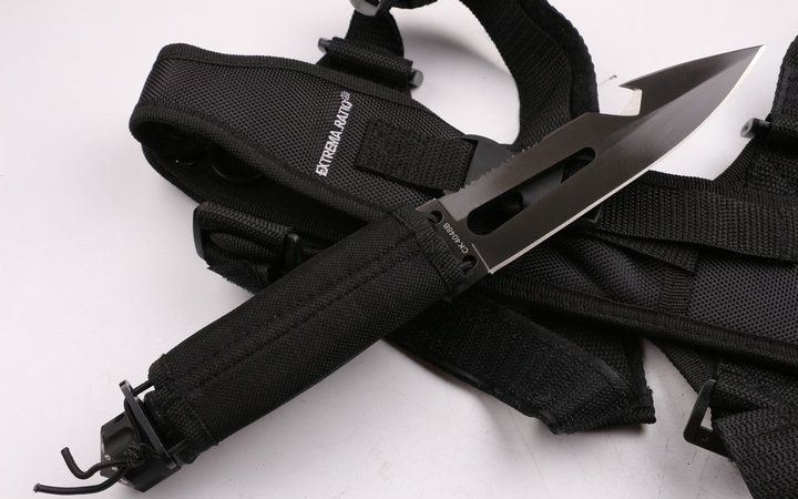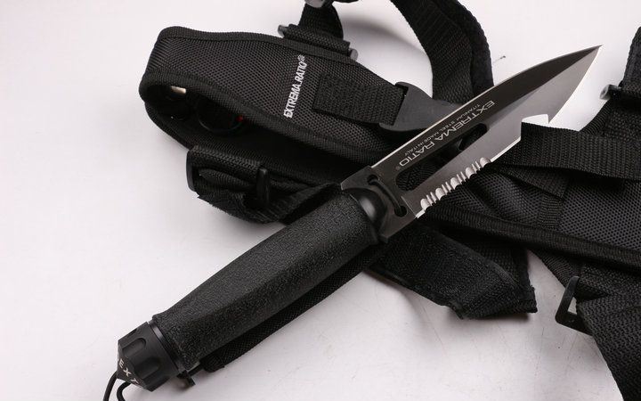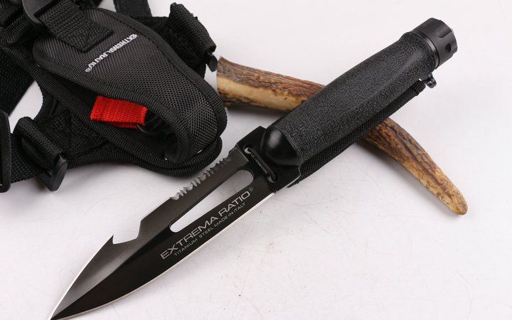 意大利极端武力(军用)潜水救生套刀 全 长: 29.5cm 刃 长: 14.4cm 刃 宽: 3.8 刃 厚: 0.63 净 重: 420g 毛 重: 800g 硬 度: 57HRC 刃 材: 5Cr13 表 面: 钛离子 柄 材: 太空铝 刀 鞘: 牛津袋 其 它: 锋利 有出世纸.加配更换的防水圈和橡皮刷(刷去水痕作用),结实的全龙骨刀柄,可以拆装