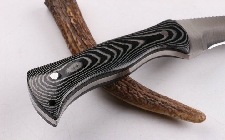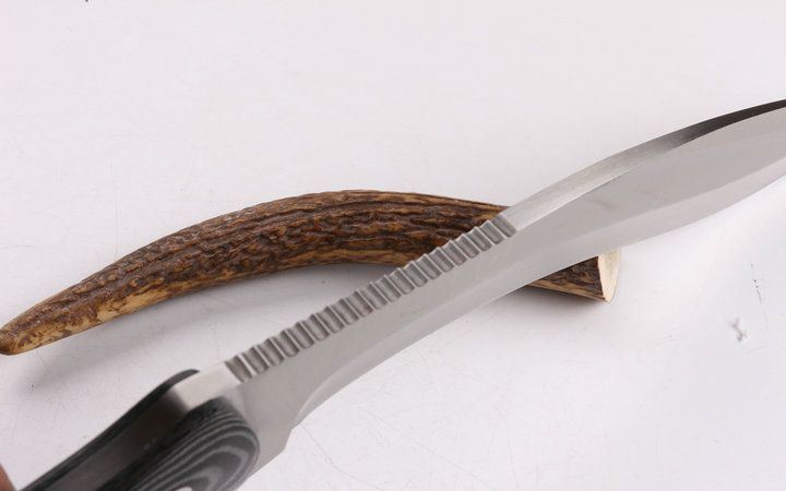 松田菊男瘦身狗腿(砂光版) 全 长:39cm 刃 长:25.8cm 柄 长:14.2cm 刃 宽:4.5cm(最宽处) 刃 厚:6.2mm 刃 材:5CR13MOV 硬 度:58HRC 刀 柄:G10柄 表 面:精细沙光 重 量:850克(含包装)