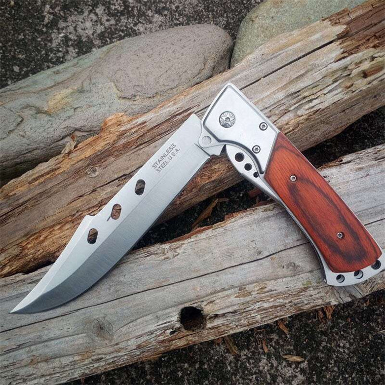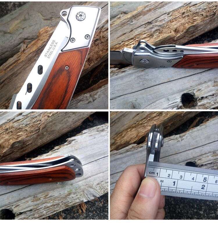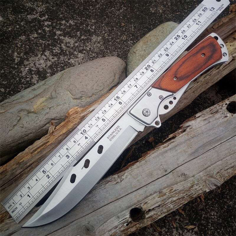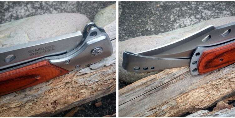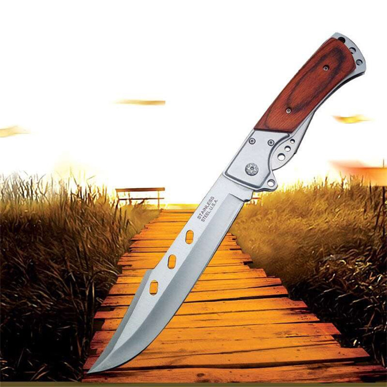 燕尾大折刀 全长: 27.2cm 闭合长度: 18.5cm 刃长: 14cm 柄长: 12.5cm 刃厚: 4cm 刃宽: 3cm 刃材: 3Cr13MOV 表面处理: 砂光 柄材: 钢头+彩木 硬度: 54HRC 重量: 250克(包装) 锁定: 无锁