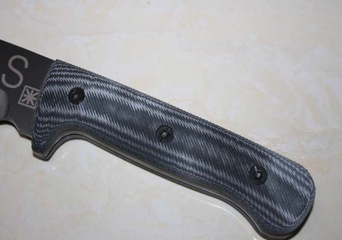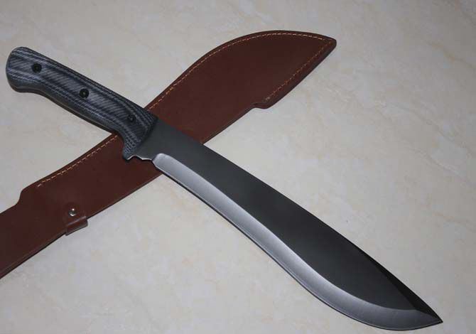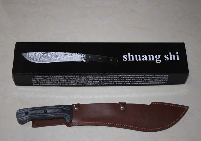 全 长:500mm 刃 长:330mm 柄 长:150mm 刃 宽:55mm 刃 厚:6mm 刃 材:3Cr13Mov 重 量:1000g(含包装) 硬 度:55HRC 表 面:钛 柄 材:G10柄 锁 型:定锁 其 他:配纸盒和皮套