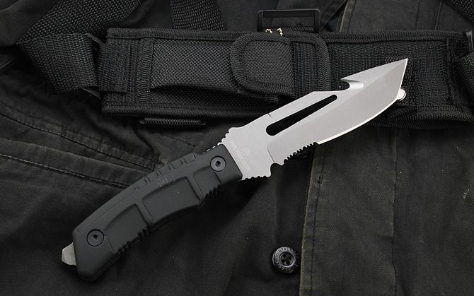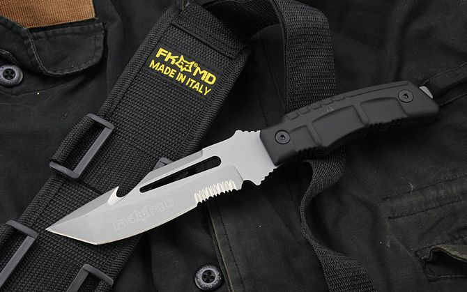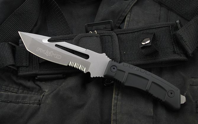 狐狸(FOX)美军探险潜水刀半齿 全长:26.8cm 刃长:13cm 柄长:12.5cm 刃厚:4.6mm 刃宽:3.5cm 刃材:5Cr13 柄材:橡塑 硬度:57HRC 净重:290克 毛重:630克 表面处理:灰钛 结构:龙骨结构,刀身贯穿刀柄,非常牢固