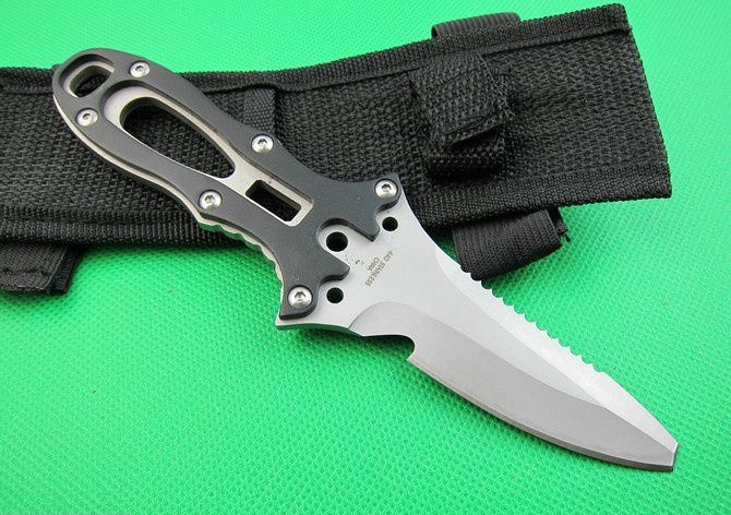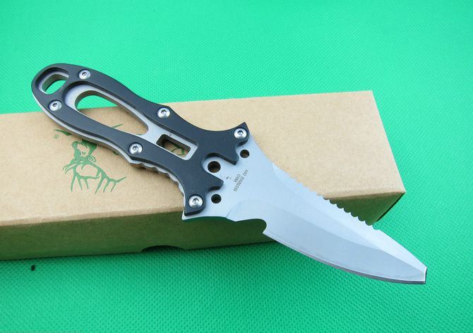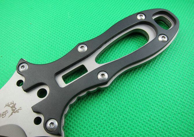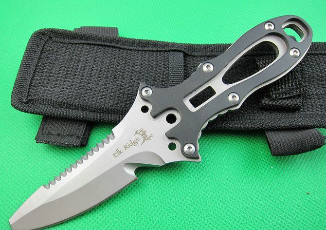 Elk Ridge.鹿头牌求生潜水刀 全 长:19.9cm 刃 长:8.0cm 柄 长:10.0cm 刃 宽:3.0cm(最宽处) 刃 厚:3.3mm 刃 材:440 硬 度:57HRC 刀 柄:直身全钢柄,两面外夹铝片 表 面:喷砂 重 量:240.0克 其 他:刀刃锋利,带割绳回钩,刀背带背齿;尼龙刀套,配绑腿带。