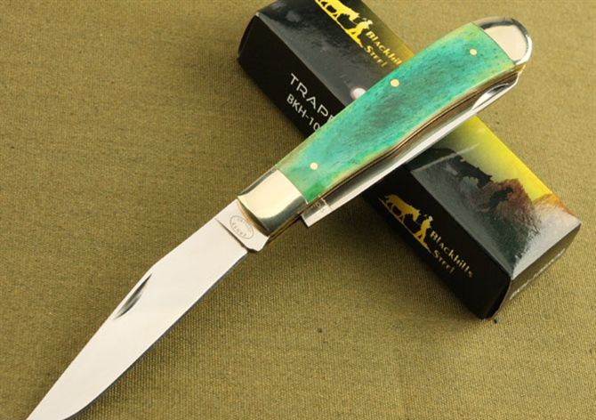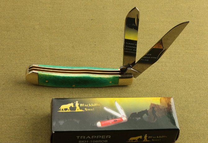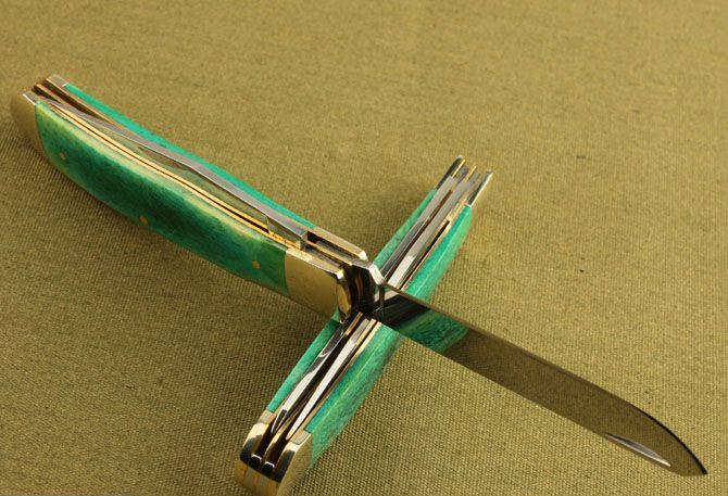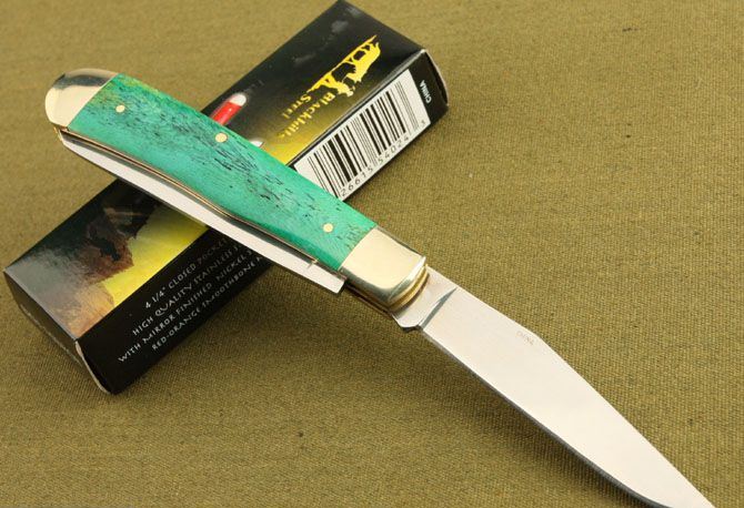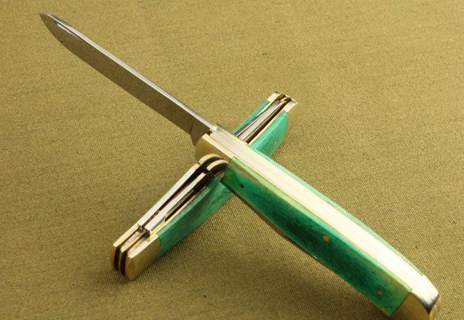 老坑翡翠双开折刀 全长:18.5cm 刃长:8cm 柄长:10.6cm 刃厚:0.21cm 刃宽: 1.2cm 刃材: 8Cr13MOV 柄材: 双铜头+骨片 硬度: 58HRC 净重:100克 毛重:108克 表面处理:镜光 其他:彩盒