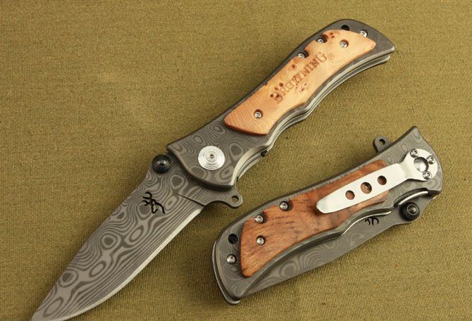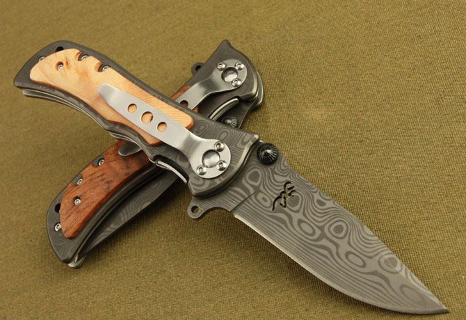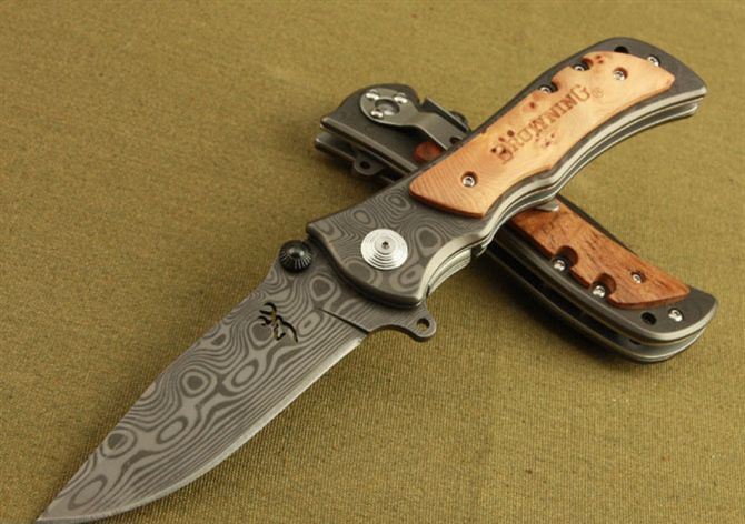 勃朗宁339仿大马士革折刀 全 长: 20.2cm 刃 长: 8.5cm 刃 宽: 3cm(最宽处) 柄 长: 11.2cm 刃 材: 440C 硬 度: 57HRC 表 面: 仿大马士革 刃 厚: 0.3cm 柄 厚: 1.9cm 柄 材: 白影木 净 重: 220克 包 装:原装纸盒 锁 闭: 舒适型侧锁,刀刃打开后,非常牢固 其 他:镂空标志,采用高精密度的标准件,各衔接部位非常的协调,构造十分精密
