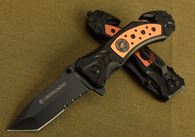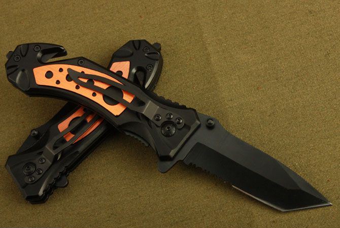 332救生折刀 全 长:21cm 刃 长:8.5cm 柄 长:12cm 刃 厚:2.8mm 刃 材:3Cr13 柄 材:铝 硬 度:55HRC 表 面:镀钛 重 量:150g 锁 定: 线锁
