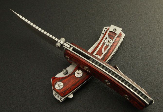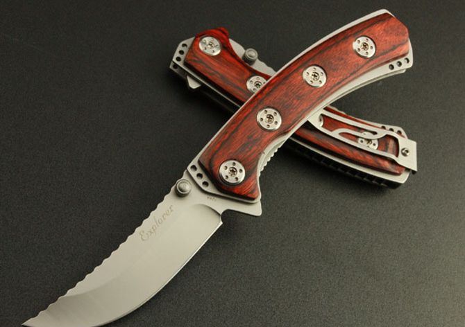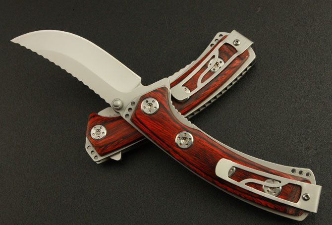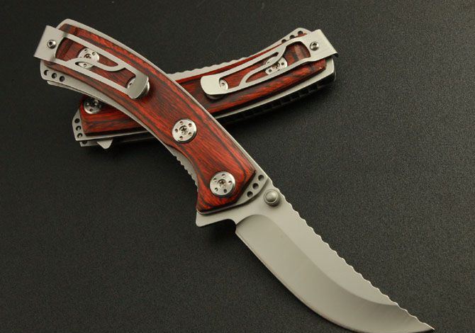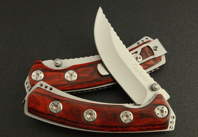 网络124折刀 全 长:19.5cm 刃 长:8cm 柄 长:10.5cm 刃 厚:0.28cm 刃 材:3Cr13 柄 材:彩木 硬 度:55HRC 表 面:灰钛 重 量:125g 锁 定: 侧 锁