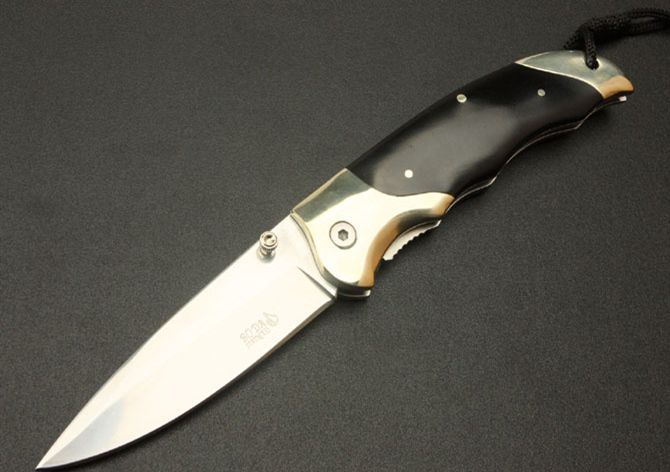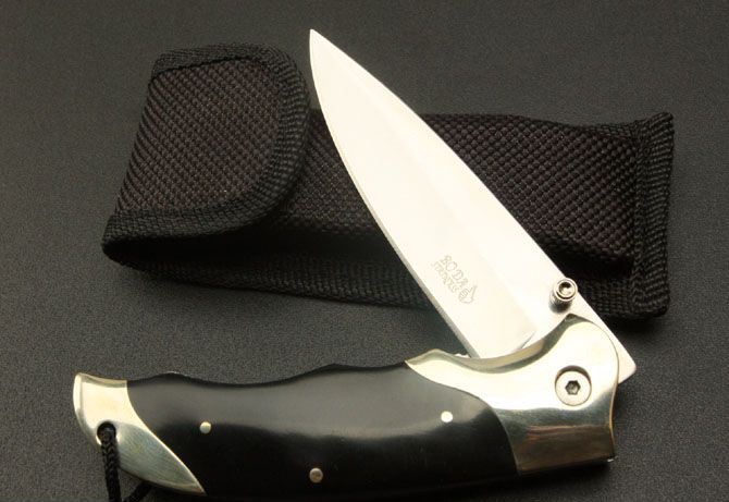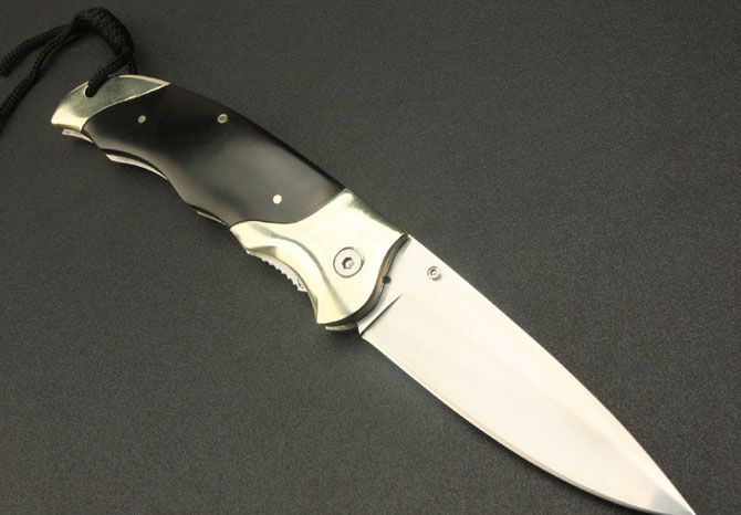 白钢飞狐折刀 全长:20cm 刃长:8.5cm 柄长:11cm 刃厚:2.8mm 刃材: 3Cr13 柄材: 白铜头+牛角 硬度: 55HC 重量:160克 表面处理:钢本色 锁型:侧锁
