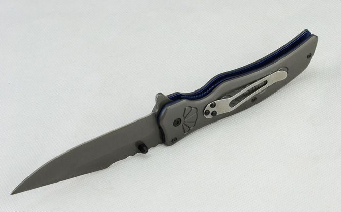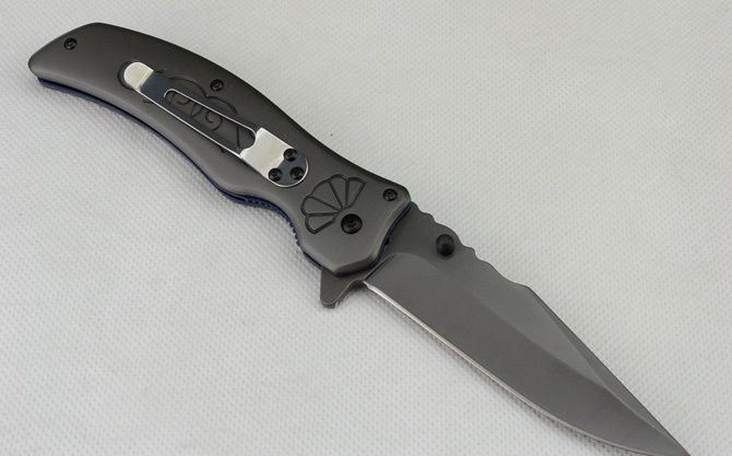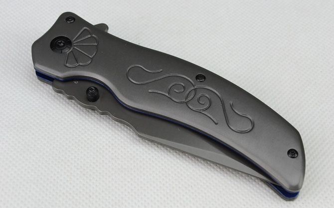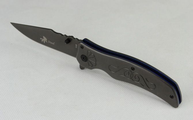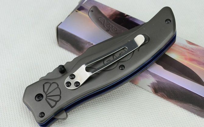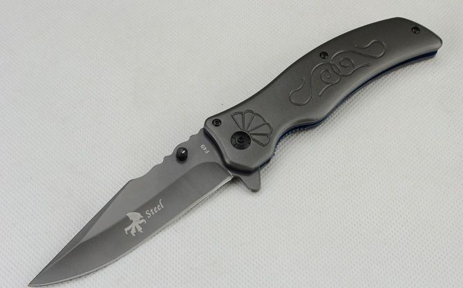 F49折刀 全长: 21.5cm 刃长: 10cm 柄长: 12.5cm 刃厚: 2.8mm 刃宽:2.7cm 刃材: 3Cr13 柄材: 全钢,双层垫片 硬度: 55HRC 重量: 241克(含彩盒包装) 表面处理: 灰钛 锁型: 快开 备注: 带腰夹