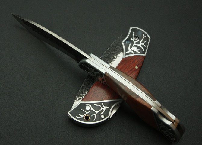 刃材:5Cr13 硬度: 56HRC 全长:21.5CM 刃长:9CM 刃厚: 0.27CM 刃宽:3CM (最宽处) 柄长: 12CM 重量:170克 涂层:热扎 柄材: 铝+花梨木 锁定: 制尾