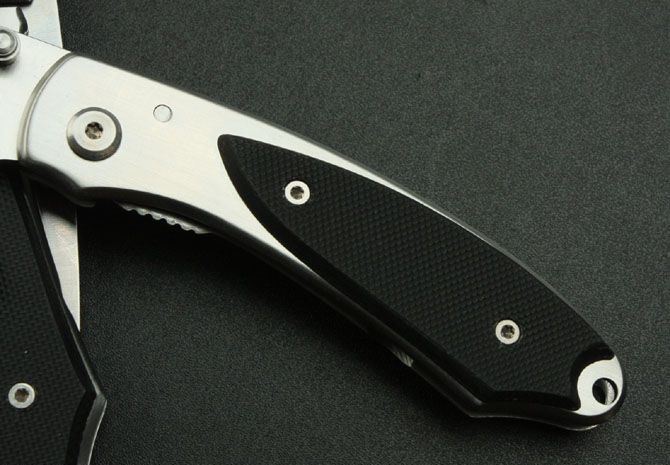 全长:16.5cm 刃长:6.8cm 柄长:9.5cm 刃厚:2.3mm 刃宽: 2.2cm 刃材: 5Cr13MOV 柄材:黑G10 硬度: 57HRC 毛重:100克 表面处理:砂光 锁型:线锁