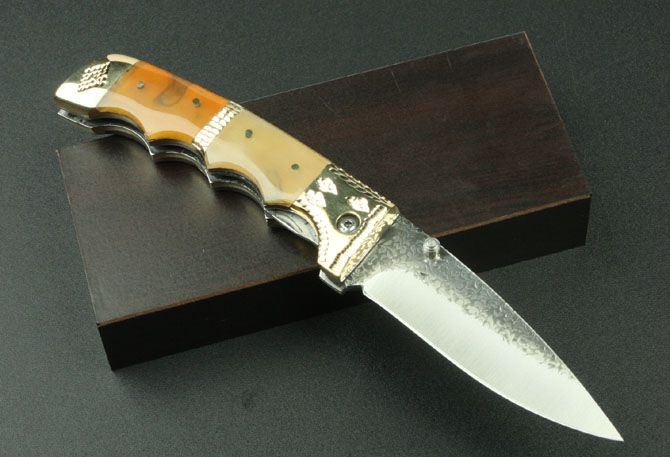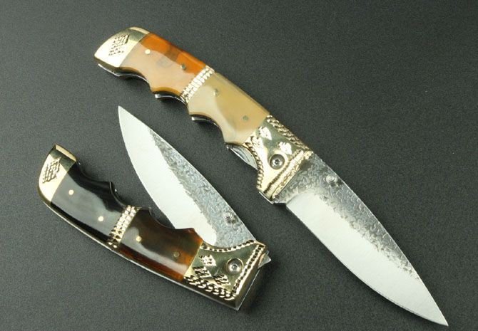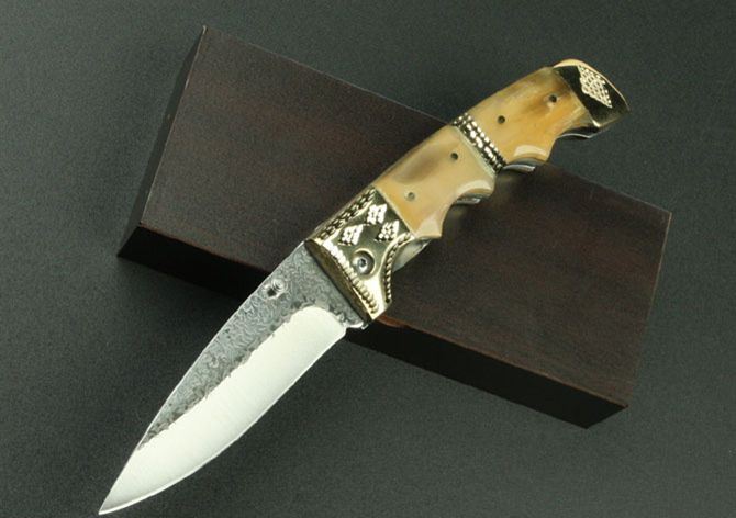 武峰作锻花收藏折刀 全长:20.6cm 刃长:8.8cm 刃宽:2.7cm 刃厚:0.28cm 柄长:11.3cm 刃材:5Cr13Mov(锻打) 硬度:58HRC 刀重:240克 总重:340克(含包装物) 柄材:扎花铜+花牛角 品质:高品质 锁型:线锁