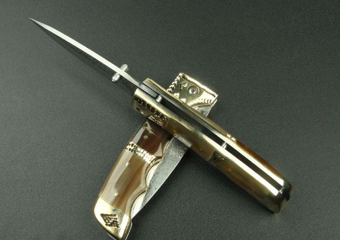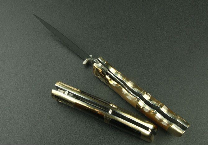 全长:20.6cm 刃长:8.8cm 刃宽:2.7cm 刃厚:0.28cm 柄长:11.3cm 刃材:5Cr13Mov(锻打) 硬度:58HRC 刀重:240克 总重:340克(含包装物) 柄材:扎花铜+花牛角 品质:高品质 锁型:线锁