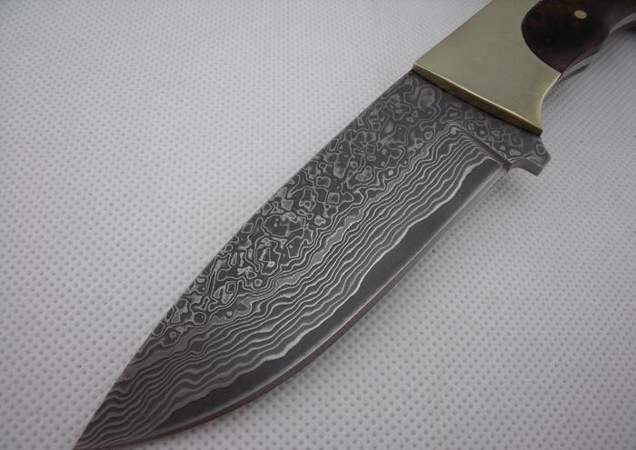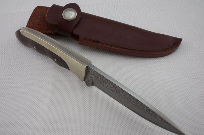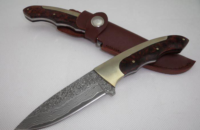 全 长: 20.5cm 刃 长: 9.5cm 刃 宽: 3.0cm(最宽处) 硬 度: 58HRC 刃 厚: 0.32m 柄 长: 11cm 柄 材: 珍稀红影木+纯铜 刃 材: 进口大马士革钢 表 面: 大马士革钢特有的花纹原色 其 他: 刃口锋利,真皮套 大马士革钢花纹和把手木纹及颜色各异,以实物为准!