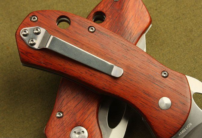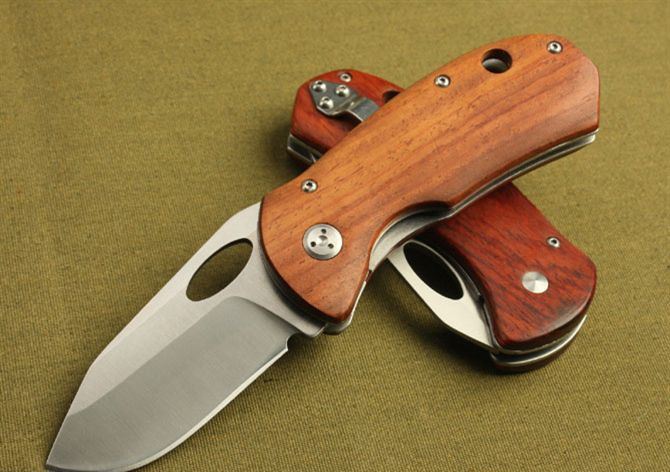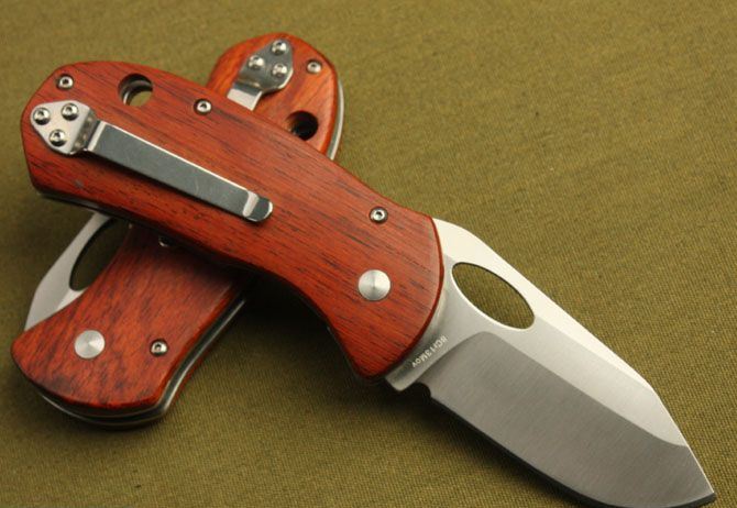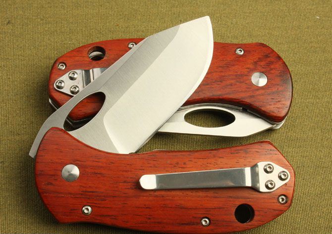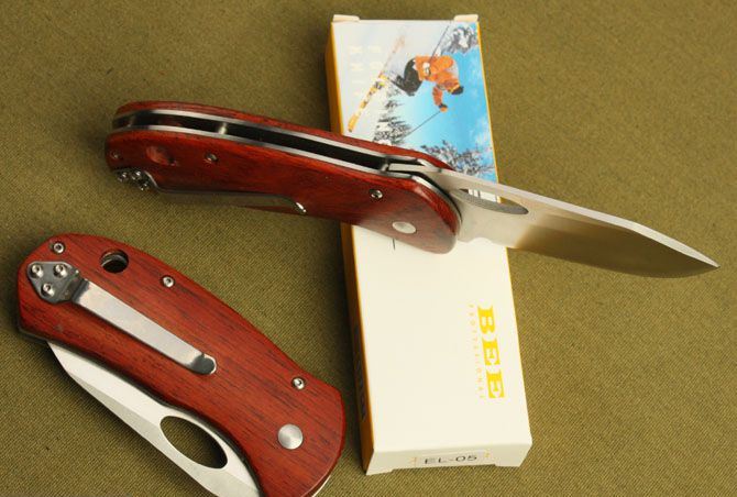 BEE-EL05折刀 全长:18cm 刃长:7.3cm 柄长:10.7cm 刃厚:2.9mm 刃宽: 4cm 刃材: 8Cr13 柄材: 红酸枝 硬度: 57HRC 净重:140克 毛重:148克 表面处理:手工砂光 锁型:侧锁