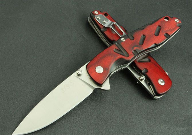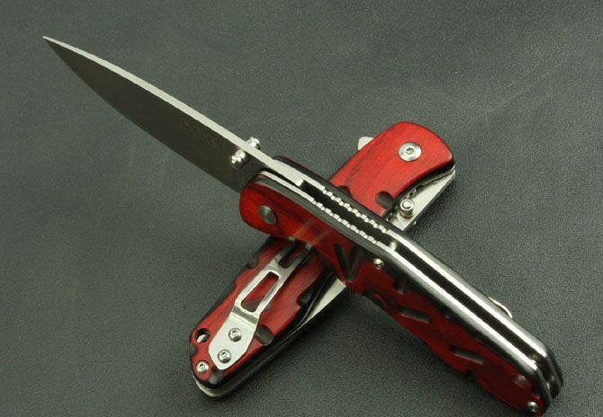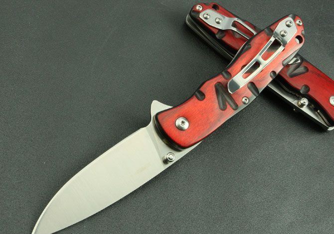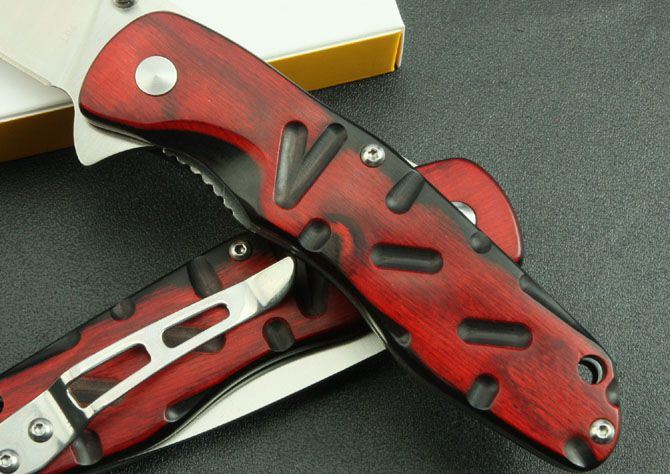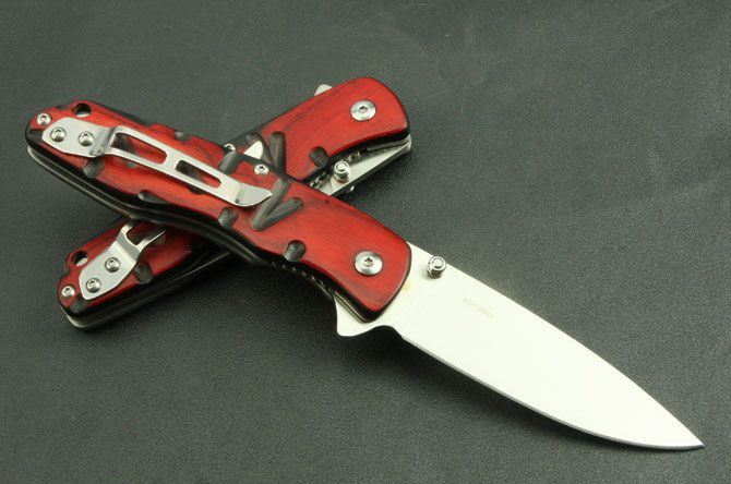 BEE-L04战术折刀 全长:19.5cm 刃长:8.2cm 柄长:11cm 刃厚:2.7mm 刃宽: 2.5cm 刃材: 8Cr13Mov 柄材: 红色彩木 硬度: 57HRC 净重:108克 毛重:118克 表面处理:手工砂光 锁型:侧锁