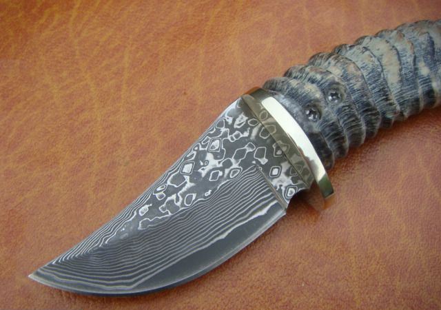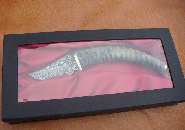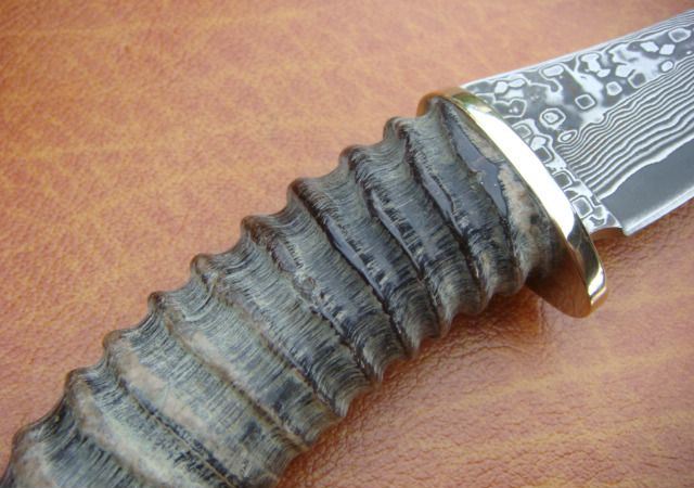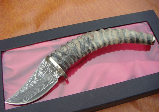 刃 长: 7.5cm 刃 厚: 3.5mm 刃 材: 大马士革钢 硬 度: 58HRC 净 重: 660g 柄 材: 白铜+珍稀羚羊角 包装:高档礼盒(合子以实物为准) 大马士革钢上的花纹是经过多层锻打而形成,再经过酸蚀才能明显突现它的光彩!(注意:用砂纸会把花纹擦掉,但由于花纹是大马士革本身固有的,再经过酸蚀又能恢复原来花纹. 但不能说他就不是大马士革,这是对大马钢的误解!)