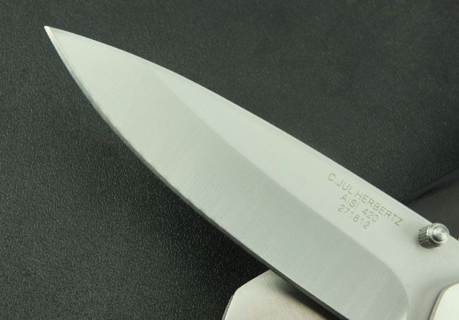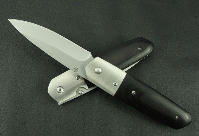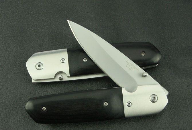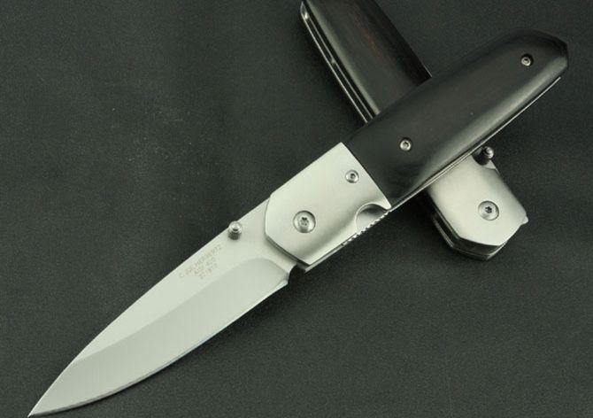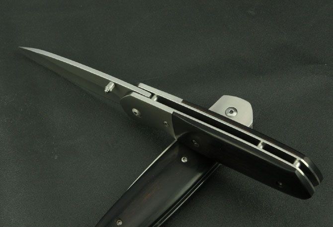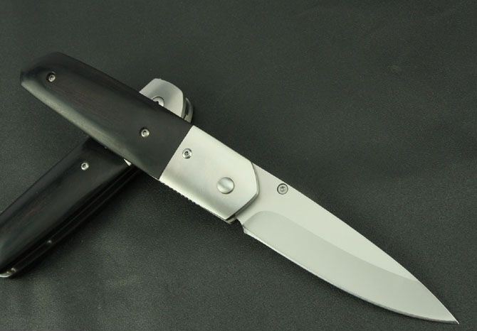 C.J.H-2718折刀 全 长:200mm 刃 长:80mm 柄 长:115mm 刃 宽:23mm 刃 厚:2.8mm 刃 材:5Cr13Mov 重 量:130g(含包装) 硬 度:57HRC 表 面:灰钛 柄 材:钢头+黑彩木 锁 型:定锁 其 他:配白色纸盒
