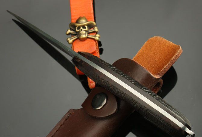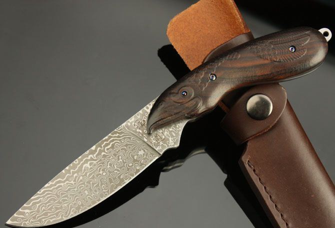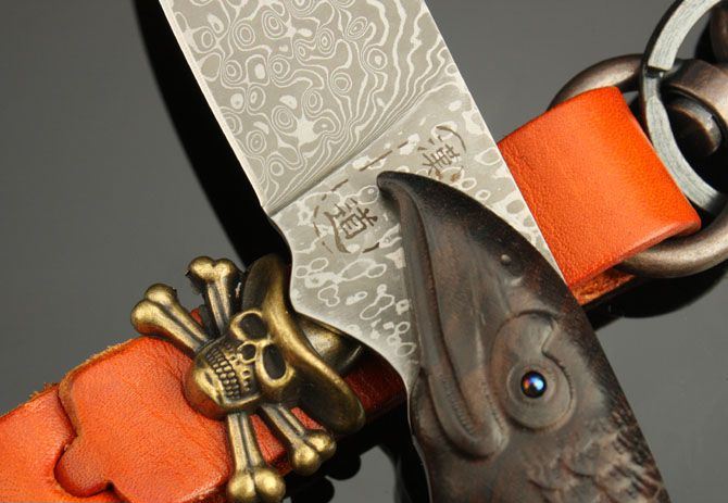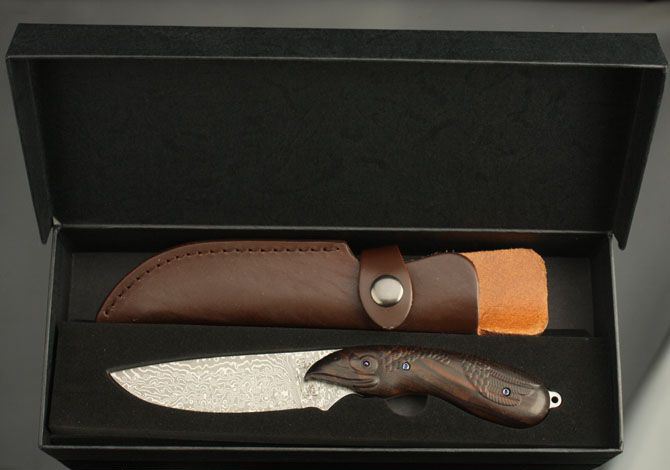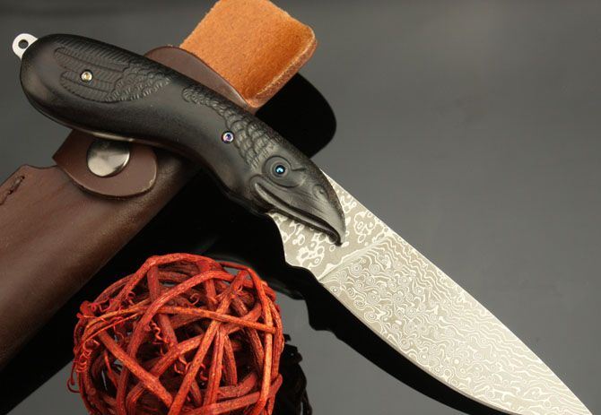 大马士革-飞鹰使者 全 长: 20.5cm 刃 长: 8.8cm 刃 宽: 2.6cm(最宽处) 硬 度: 58HRC 刃 厚: 0.27m 柄材:黑檀木 柄 长: 11.5cm 刃 材: 进口大马士革钢 表 面: 大马士革钢特有的花纹原色 其 他: 刃口锋利,真皮套,背景物品不作赠送 大马士革钢花纹和把手木纹及颜色各异,以实物为准!