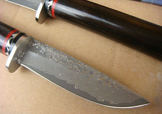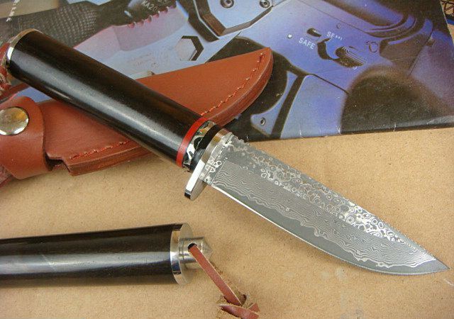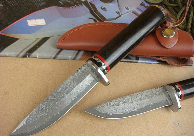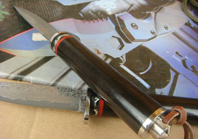 名贵黑檀木大马士革手工刀 全 长: 20.8cm 刃 长: 9.3cm 刃 宽: 2.5cm 刃 厚: 2.5mm 柄 长: 10cm 刃 材: 进口大马士革钢 硬 度: 58HRC 净 重: 100g 总 重: 130克(含皮套) 表 面: 花纹原色 柄 材: 全钢+精镶天然名贵黑檀木材 其 他: 牛皮刀套