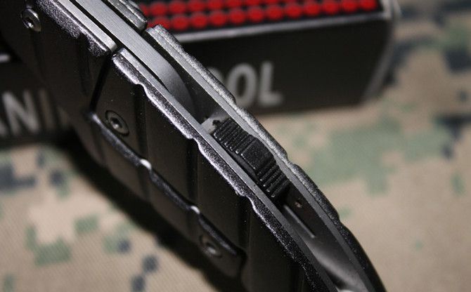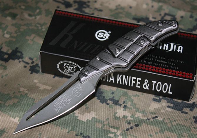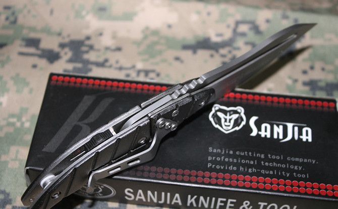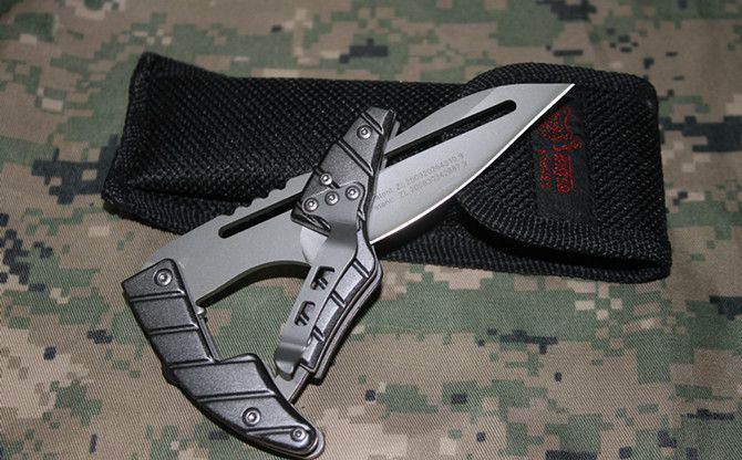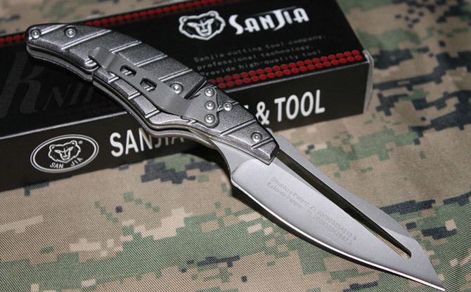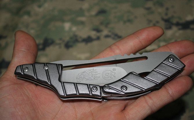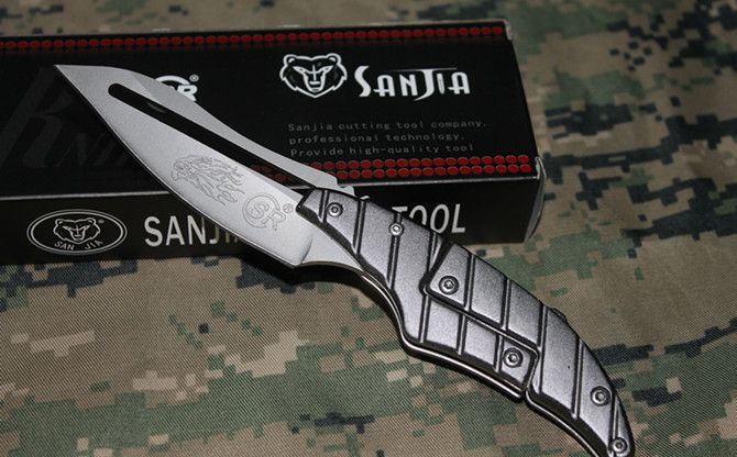蚂蟥白色 全长:17CM 刃长:7.2CM 闭 合:12.8CM 刃厚:0.25 CM 刃宽:2.3CM 柄材:金属铝 刃材:440 硬度:55HRC 重量: 100克 锁定:机械锁 刃口:锋利表面 处理:黑钛处理带背夹,原厂纸盒。 独特的造型,创新的操作方式,打破传统构思,令人焕然一新! 开刀:刀柄尾端的三角部分可以象活动夹子一样,用手指稍用力一夹,即可将刀刃打开。(看附图) 关刀:同样压住刀柄三角尾部,即可将刀刃收起。(看附图)