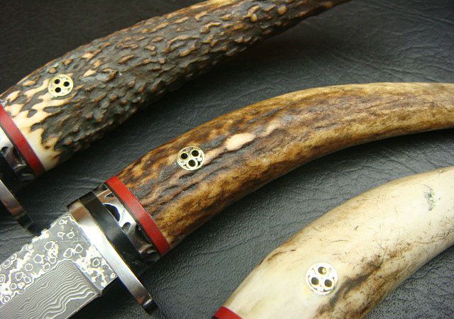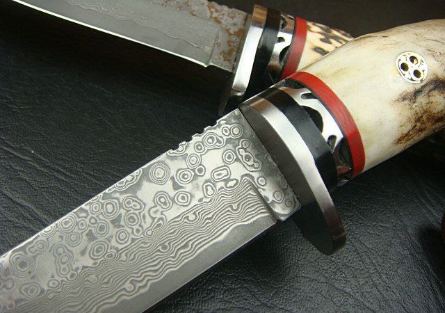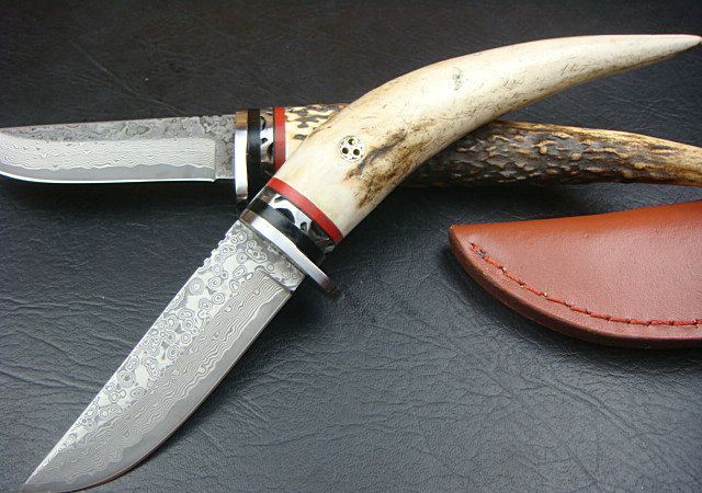 刃 长: 8cm 刃 厚: 2.5mm 刃 材: 大马士革钢 硬 度: 58HRC 净 重: 约90g 柄 材: 白钢+珍稀鹿角 包 装:真皮套