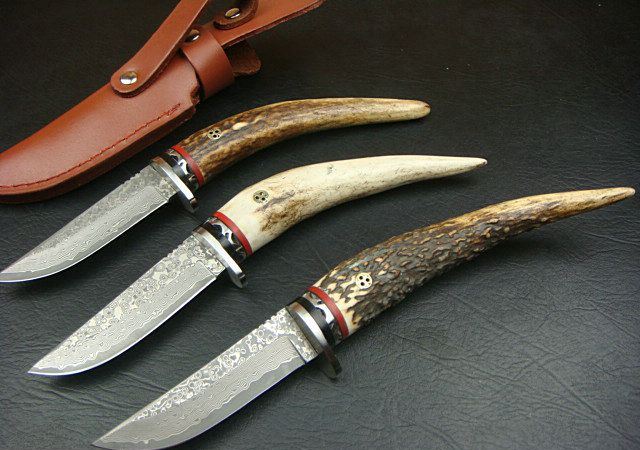进口大马士革钢鹿角收藏刀 刃 长: 8cm 刃 厚: 2.5mm 刃 材: 大马士革钢 硬 度: 58HRC 净 重: 约90g 柄 材: 白钢+珍稀鹿角 包 装:真皮套