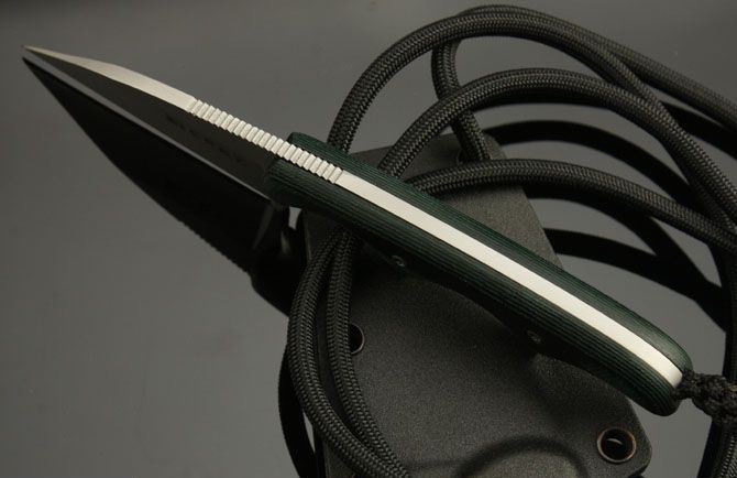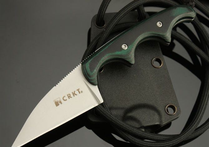 CRKT2385颈部刀 全长:12.5cm 刃长:5cm 柄长:7.5cm 刃厚:2.9mm 刃材: 7Cr17 刀重:70克 硬度: 55-57HRC 柄材: 彩木 刀鞘:ABS 刃面处理:氧化