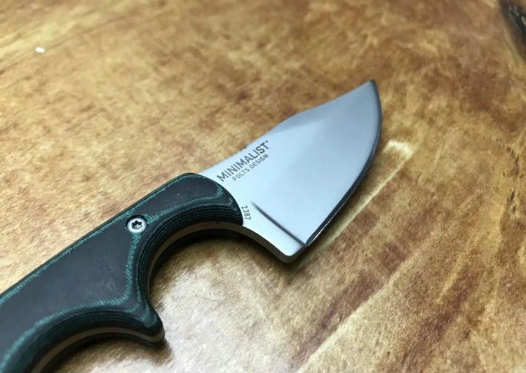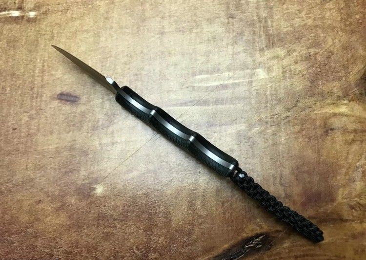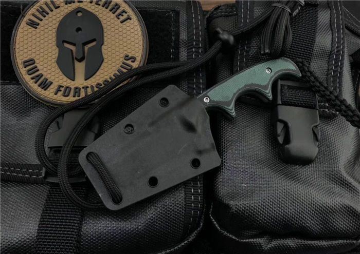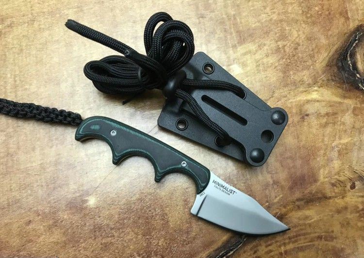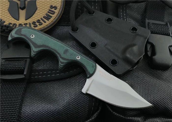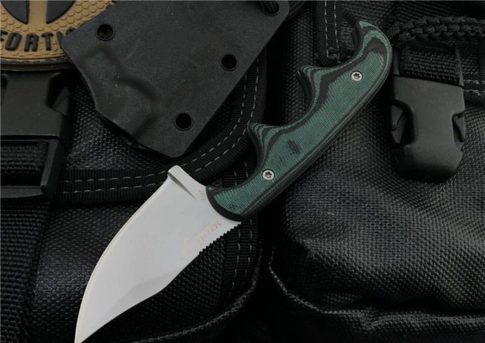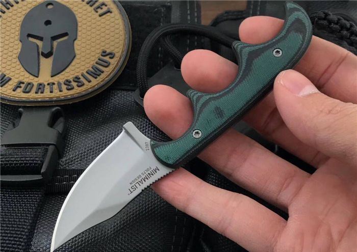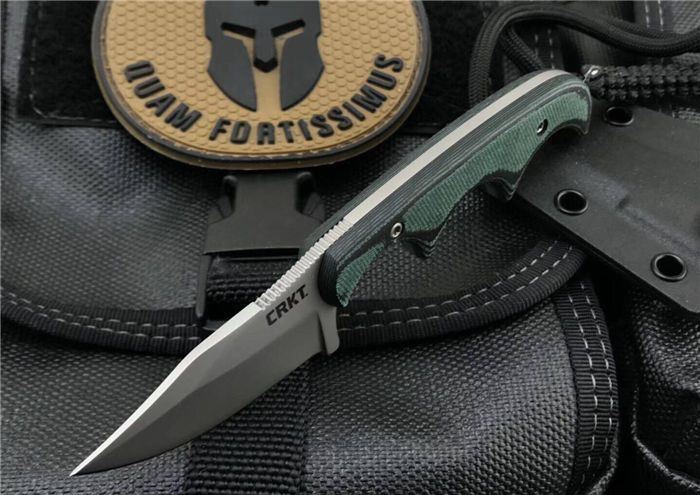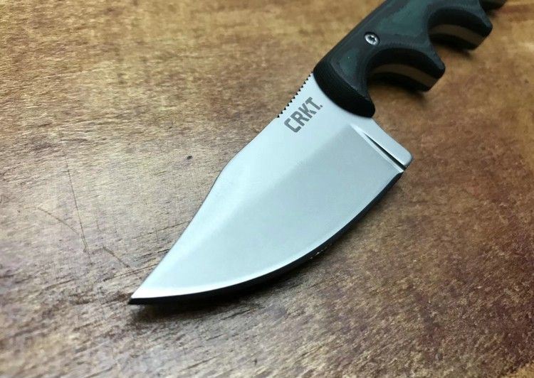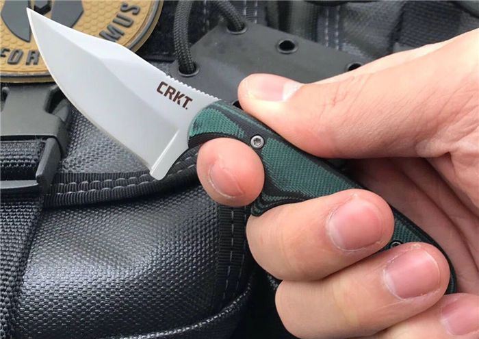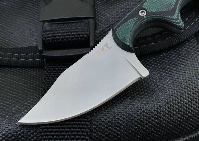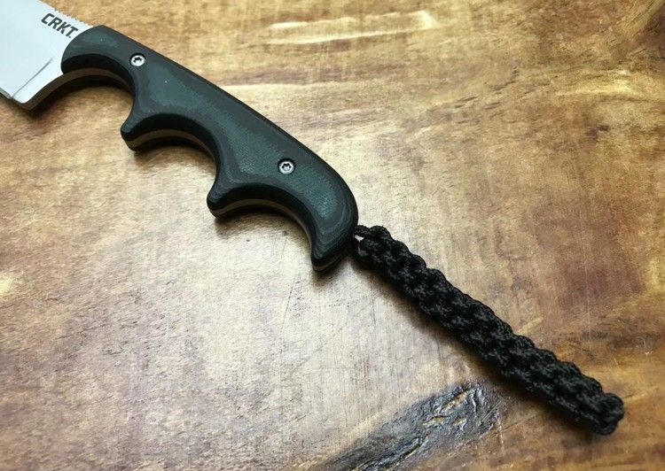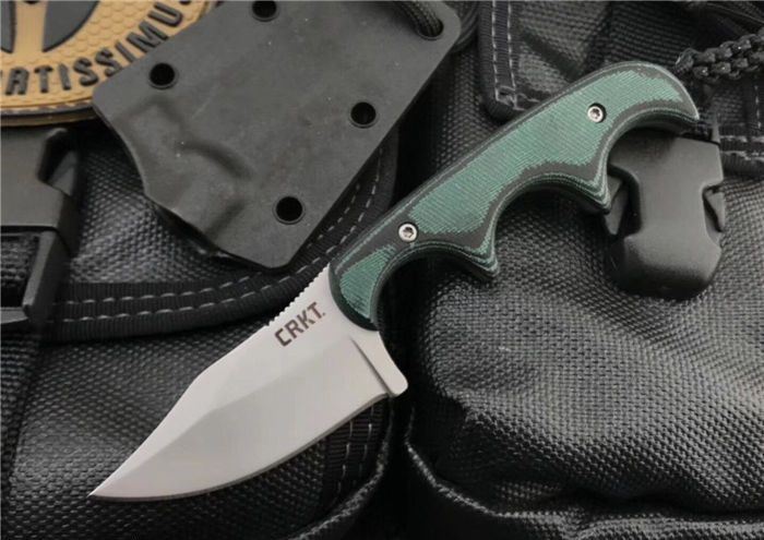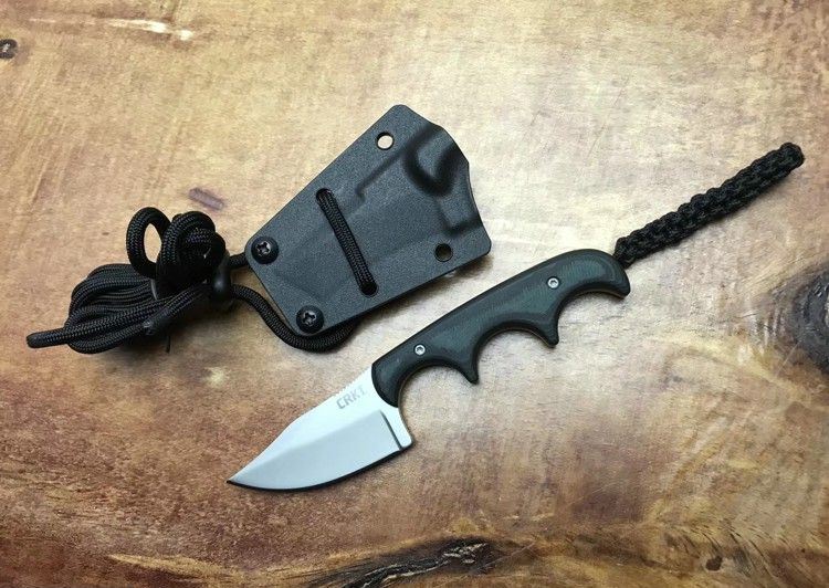 CRKT2387颈部刀 全长:13cm 刃长:5cm 柄长:7.5cm 刃厚:2.9mm 刃材: 7Cr17 刀重:70克 硬度: 55-57HRC 柄材: 彩木 刀鞘:ABS 刃面处理:氧化