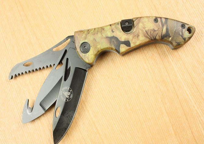 森美猎霸(三刃独立锁) 打开长:19.5 闭合长:11.5 柄宽度:3.5 柄厚度:2.5 柄 材:航空铝,表面披覆军用迷彩。 刃厚度:0.25 刃 材:440C 刀刃硬度:56-58HRC 刀刃表面处理:氧化黑 重 量: 218g 刀背带三个独立锁。