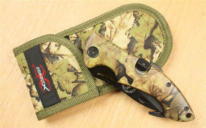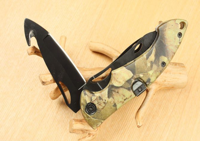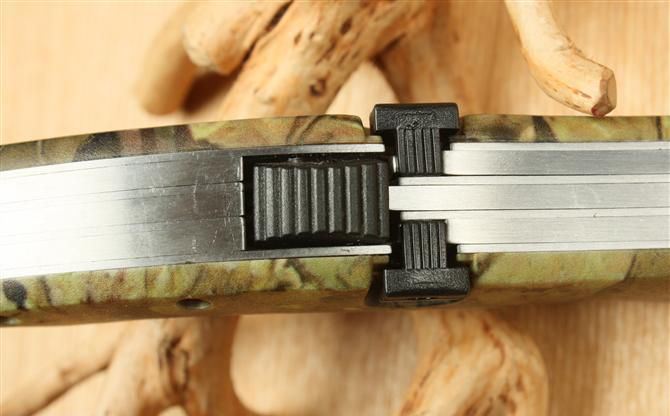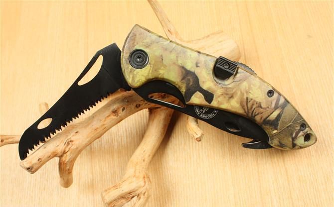 打开长:19.5 闭合长:11.5 柄宽度:3.5 柄厚度:2.5 柄 材:航空铝,表面披覆军用迷彩。 刃厚度:0.25 刃 材:440C 刀刃硬度:56-58HRC 刀刃表面处理:氧化黑 重 量: 218g 刀背带三个独立锁。
