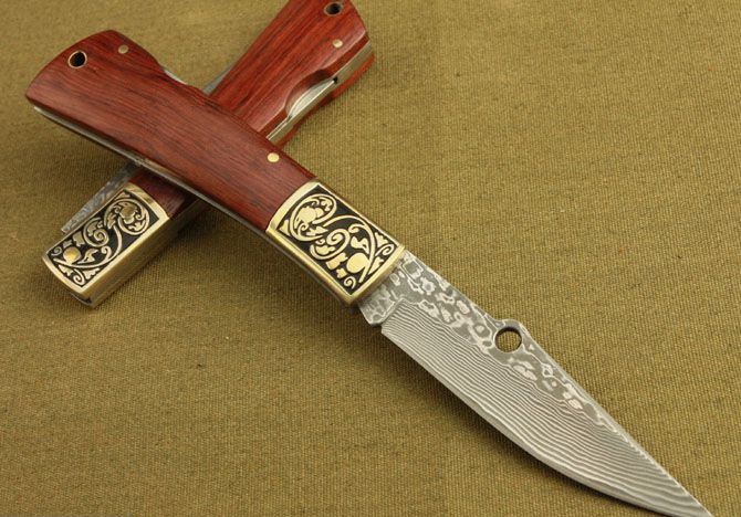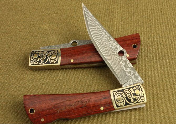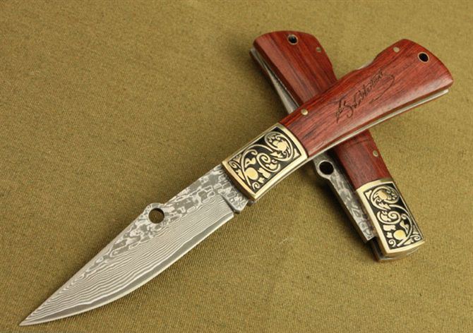 全 长: 20.5cm 刃 长: 9.5cm 刃 宽: 2.2cm(最宽处) 闭 合: 11cm 硬 度: 59HRC 刃 厚: 0.26cm 重 量: 190克(含包装) 表 面: 纯手工制造 刃 材: 大马士革 柄 材: 黄铜+红木 锁 闭: 传统式制尾锁 其 他: 大马士革钢花纹和把手木纹及颜色各异,以实物为准