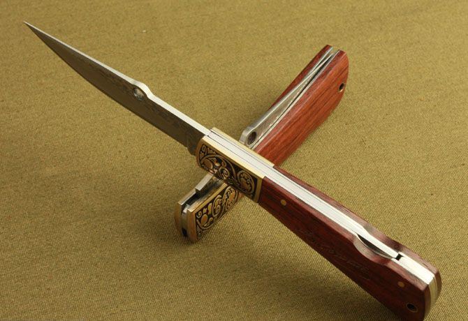 大马士革森美5号 全 长: 20.5cm 刃 长: 9.5cm 刃 宽: 2.2cm(最宽处) 闭 合: 11cm 硬 度: 59HRC 刃 厚: 0.26cm 重 量: 190克(含包装) 表 面: 纯手工制造 刃 材: 大马士革 柄 材: 黄铜+红木 锁 闭: 传统式制尾锁 其 他: 大马士革钢花纹和把手木纹及颜色各异,以实物为准