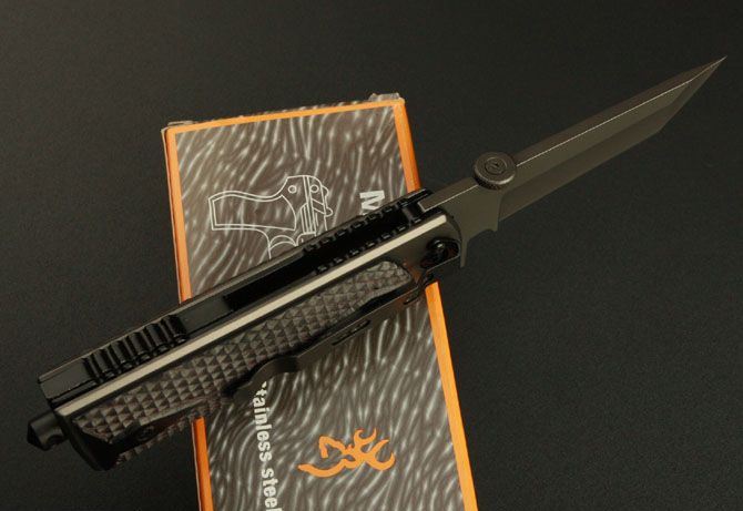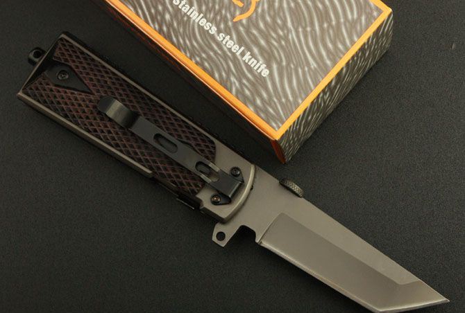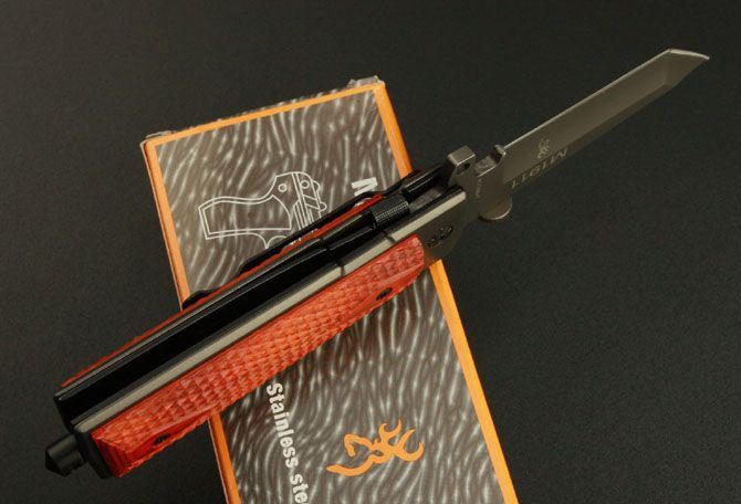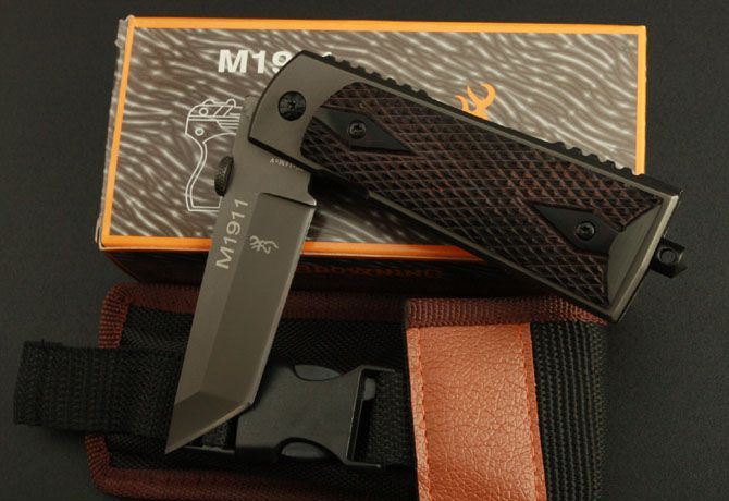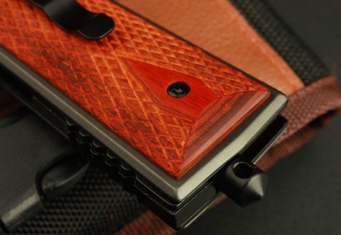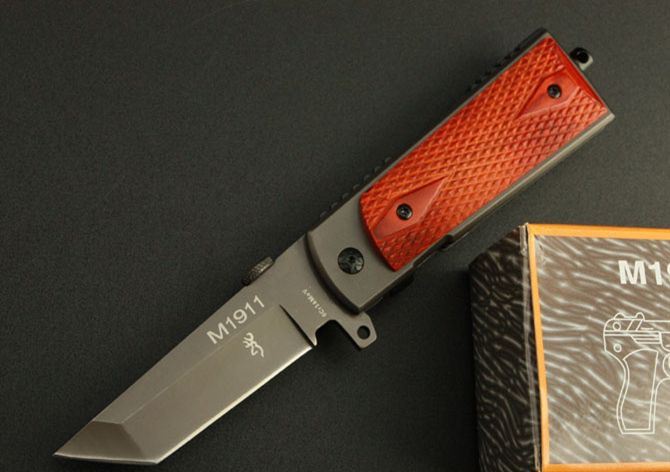 勃朗宁M1911折刀(红色) 全 长:22cm 刃 长:9.5cm 柄 长:11.5cm 刃 宽:2.7cm(最宽处) 刃 厚:3.9mm 刃 材:8Cr14MOV 硬 度:55HRC 刀 柄:木柄 表 面:镀钛 重 量:390克 锁定方式:快开