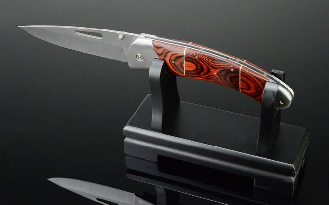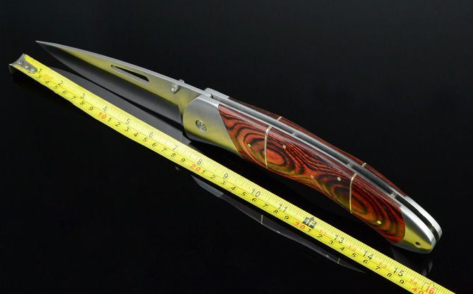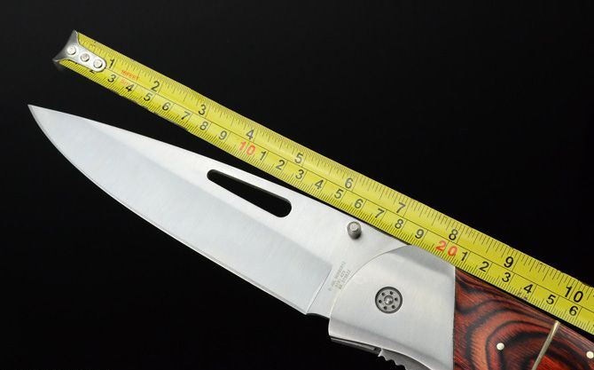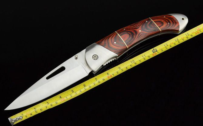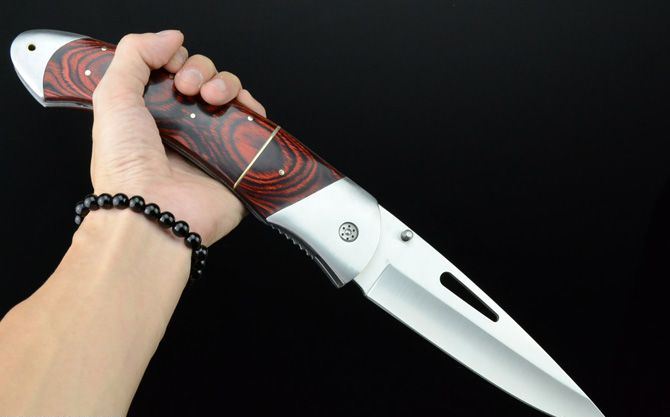 DJH巨无霸王大折刀 全 长:400mm 刃 长:165mm 柄 长:222mm 刃 宽:46mm 刃 厚:3.8mm 刃 材:5Cr13Wov 重 量:690g(不含包装) 硬 度:57HRC 表 面:砂光 柄 材:红木柄 锁 型:线锁 其 他:配尼龙套和刀架