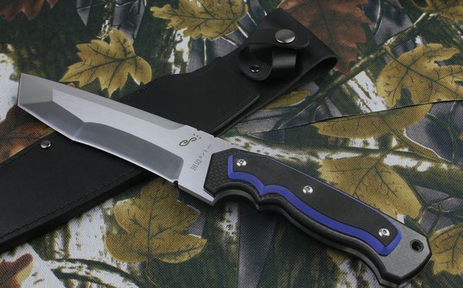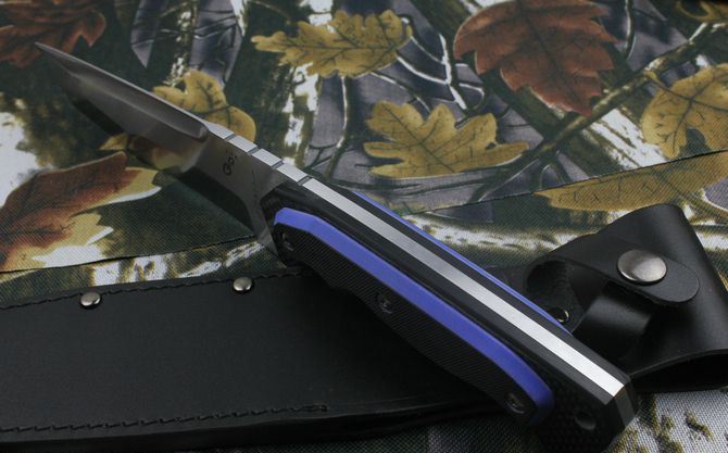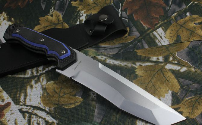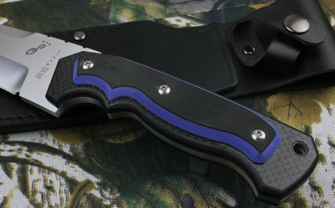 刃材:9铬钢 手柄:全数控 碳纤+双色G10 表面处理:拉丝 + 刃口镜光 刀具全长 31.8CM 刃长:17.4CM 刃厚:0.62CM 硬度:60±1HRC 热处理:真空+深冷处理 重量:单刀(543克) 连刀鞘:642克 配件:牛皮套、高级礼品盒