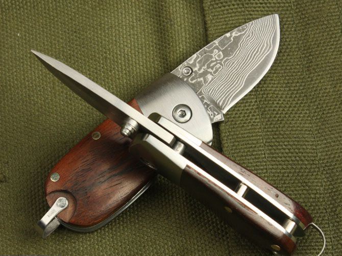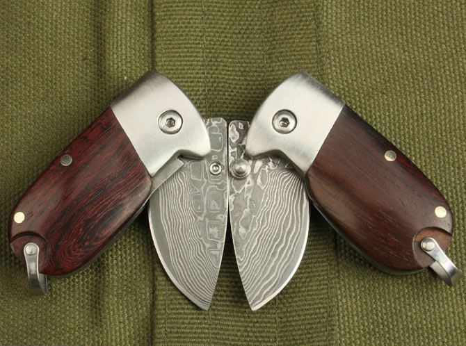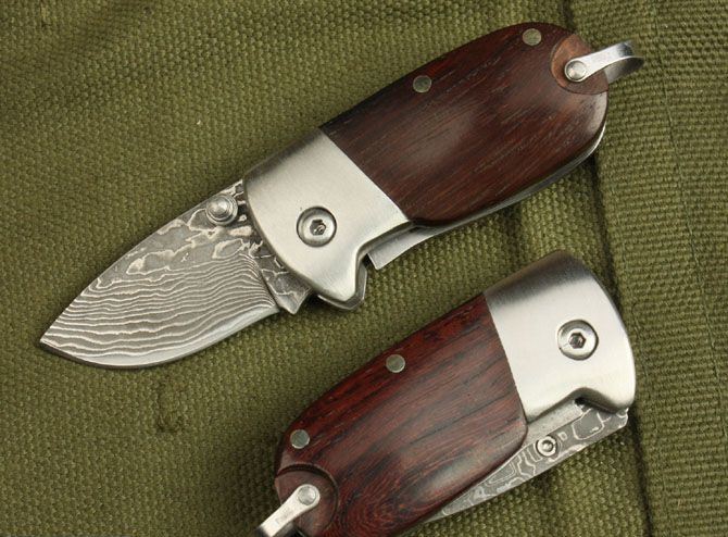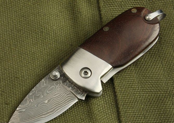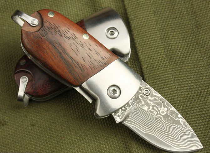 大马士革QQ折刀(黑檀木) 全 长: 9cm 柄 长:5.3cm 刃 长: 3.7cm 刃 宽: 2cm(最宽处) 闭 合: 5.3cm 硬 度: 59HRC 刃 厚: 0.23cm 净 量: 50克 毛 量:60克 表 面: 纯手工制造 柄 材: 进口黑檀木 锁 闭: 边锁 其 他: 大马士革钢花纹和把手木纹及颜色各异,以实物为准