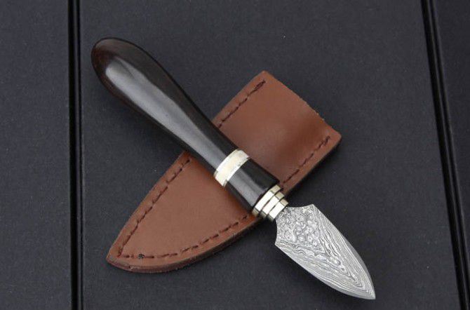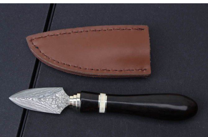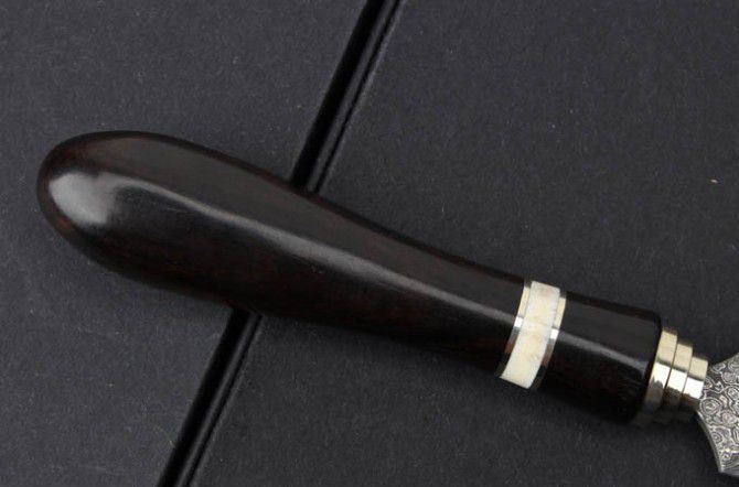 大马士革钢高端普洱茶刀 全长:165mm 刃长:60mm 柄长: 105mm 刃材:日本进口大马士革钢 马士革花纹和把手木纹及颜色各异,以实物为准