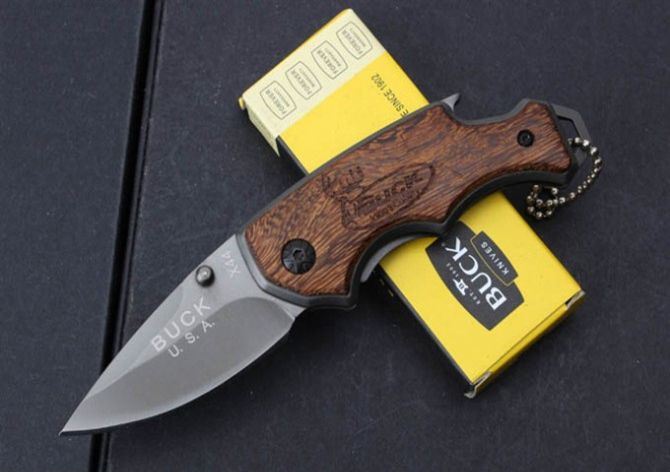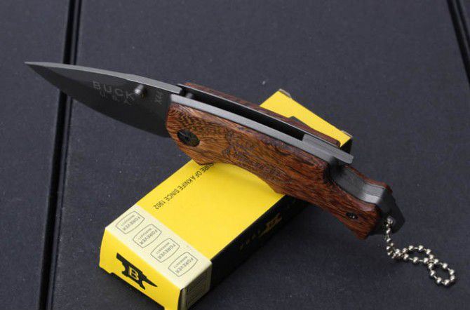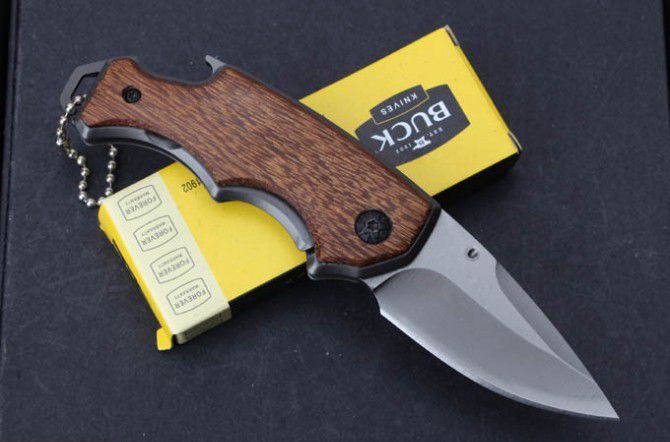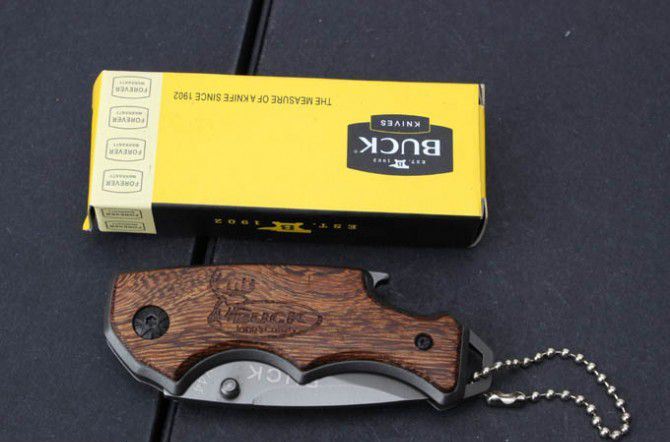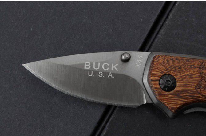 巴克X44折刀 全 长:144mm 刃 长:57mm 柄 长:90mm 刃 宽:25mm 刃 厚:2.9mm 刃 材:5Cr13 重 量:101g(含包装) 硬 度:57HRC 表 面:镀钛 柄 材:鸡翅木 锁 型:侧锁 其 他:配纸盒