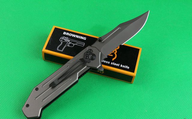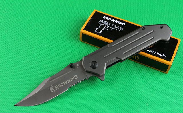 勃朗宁355快开折刀 全 长:225mm 刃 长:95mm 柄 长:126mm 刃 宽:26mm 刃 厚:3.2mm 刃 材:440 重 量:250(含包装) 硬 度:57HRC 表 面:灰钛 柄 材:全钢 锁 型:线锁 其 他:配厂盒